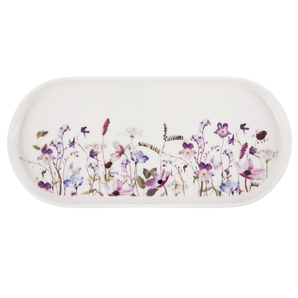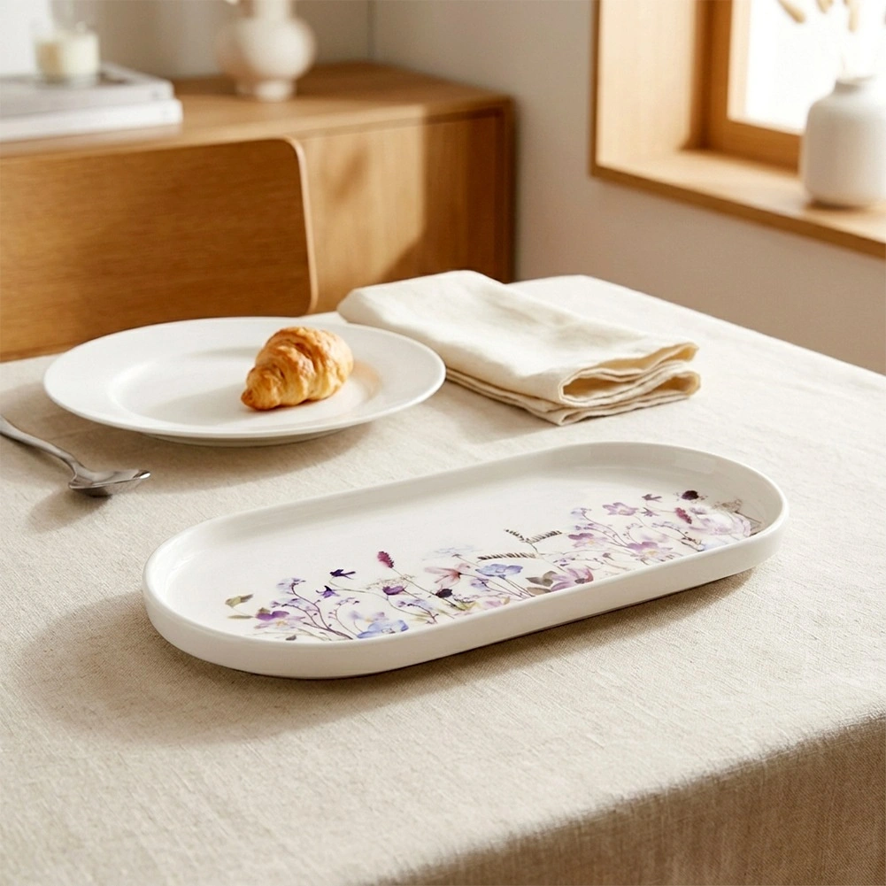 Elegante ovale porseleinen serveerschaal met een motief van weidebloemen, ideaal voor het serveren van voorgerechten, desserts of hapjes. Dankzij de afmetingen van 25 × 12 cm en de licht verhoogde rand oogt hij stijlvol en is hij tegelijk praktisch. Geschikt voor vaatwasser en magnetron, hoogwaardig porselein en modern bloemendesign maken dit een uitstekende keuze voor zowel elke dag als de feesttafel.