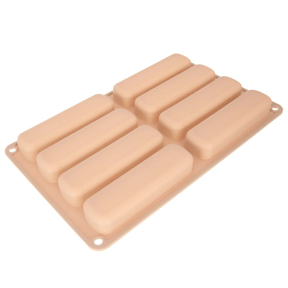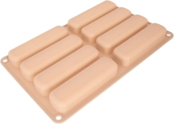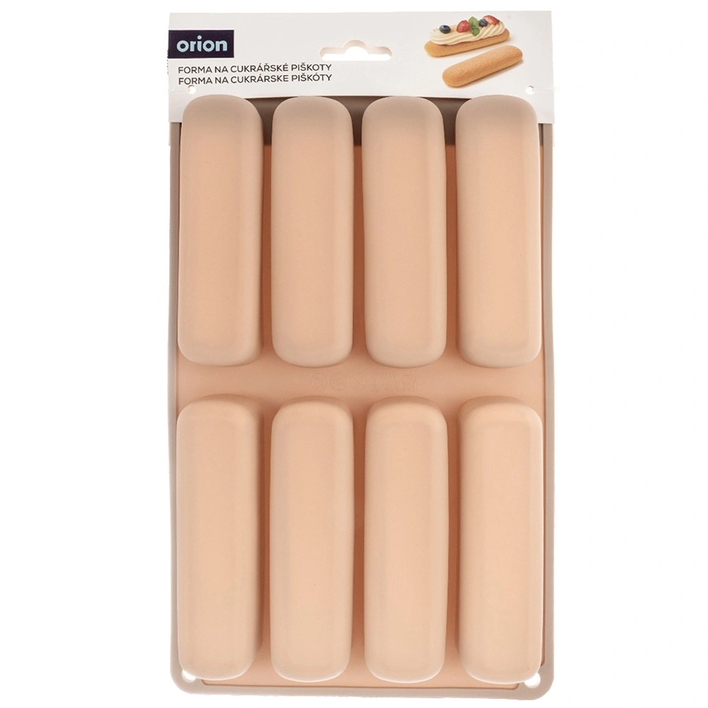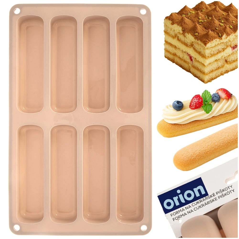Deze beige siliconen vorm is ideaal voor het maken van langwerpige lange vingers voor tiramisu, desserts in glaasjes en klassieke koekjes. De afmetingen van de vorm zijn 28 × 17 × 2 cm en elk stuk meet 11,5 × 3 × 2 cm. Het materiaal is licht, flexibel en duurzaam, wat gelijkmatig bakken en gemakkelijk lossen zonder vastplakken garandeert.