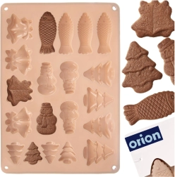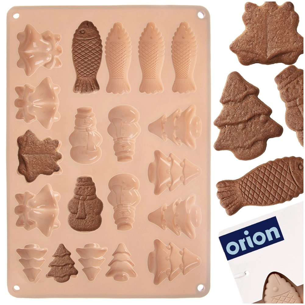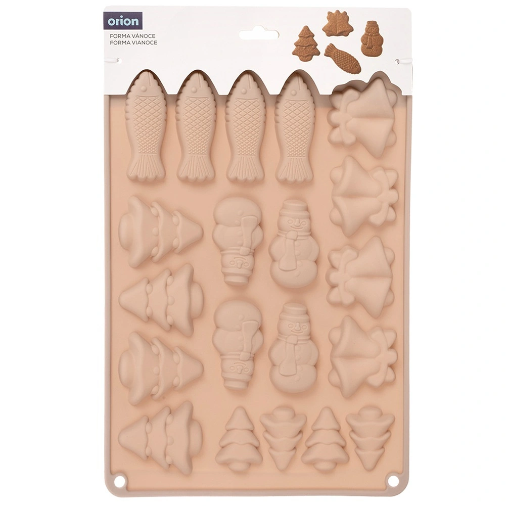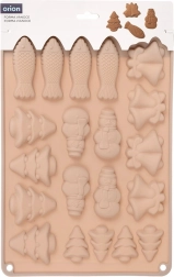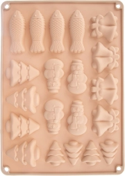 Deze beige siliconen vorm met afmetingen 34 × 24,5 × 1 cm is ideaal voor het maken van kerstkoekjes, peperkoek, chocolaatjes en pralines. Hoogwaardige siliconen garanderen eenvoudig lossen zonder vastplakken en een gelijkmatige garing of uitharding. Uit één portie maak je tot 20 stuks in 5 verschillende vormen.