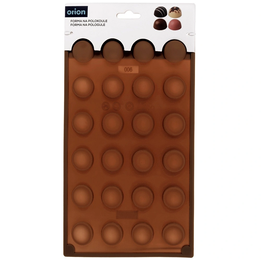 Deze bruine siliconen vorm met afmetingen 30 × 17,5 × 1,5 cm maakt elegante halfronde pralines, chocolaatjes of kleine desserts met een diameter van ca. 2,8 cm. Dankzij het flexibele materiaal los je de zoetigheden gemakkelijk uit en behouden ze hun perfecte vorm zonder te plakken.