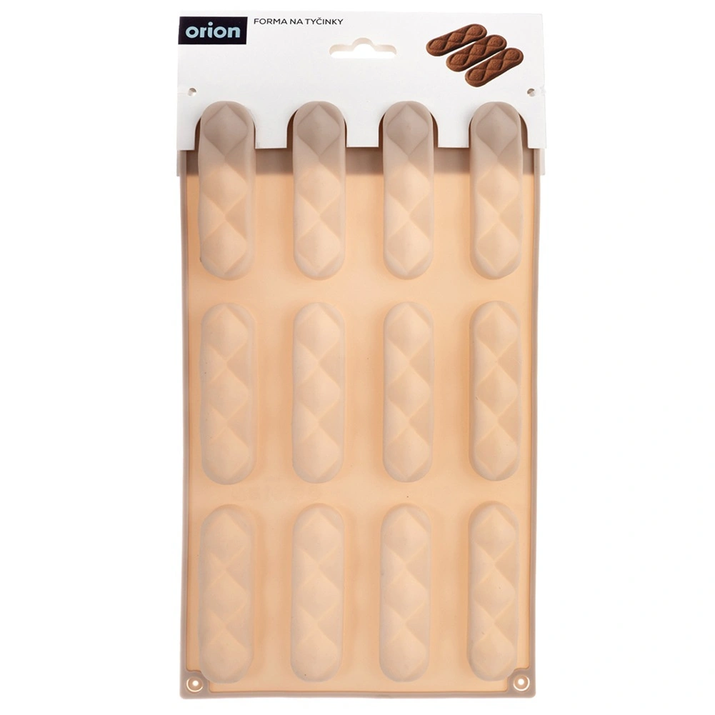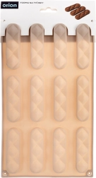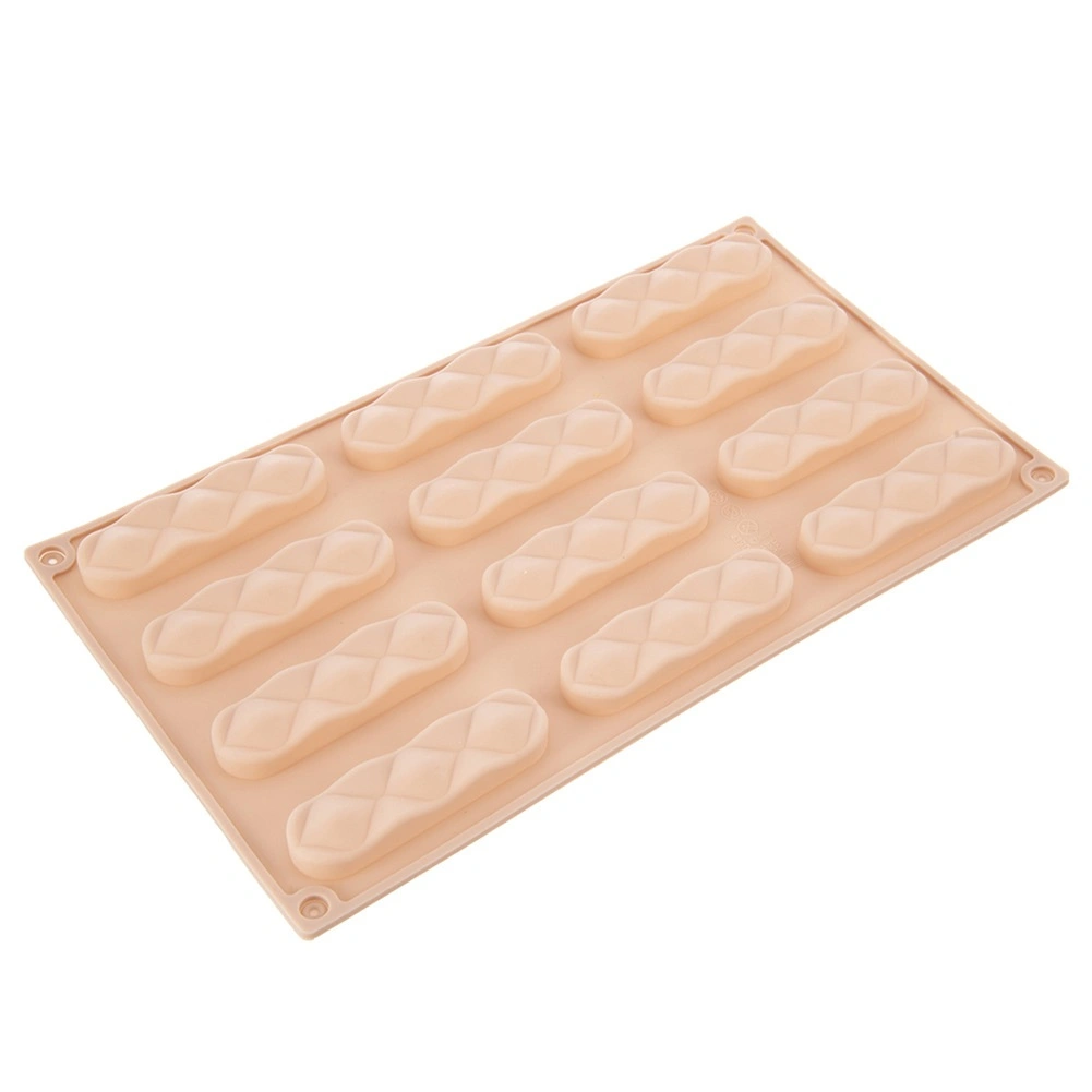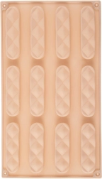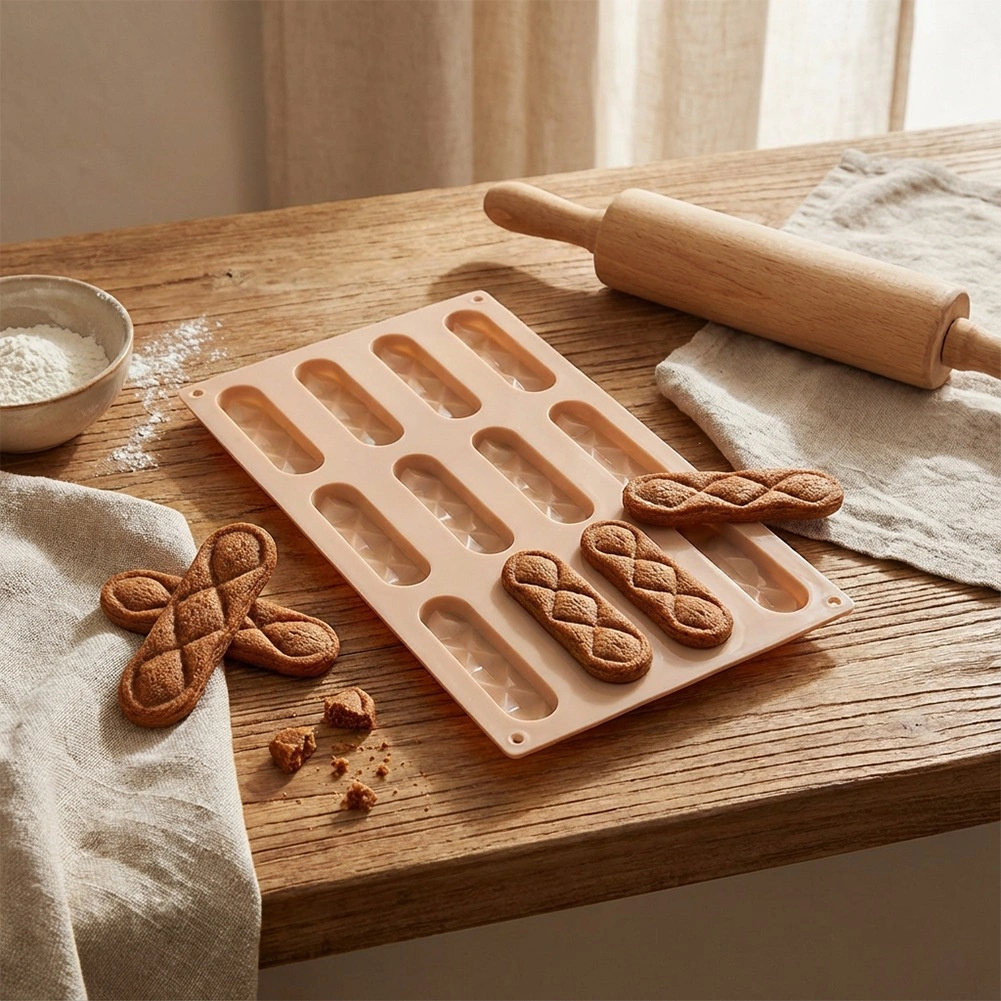 Deze beige siliconen vorm met 12 langwerpige holtes (elk ca. 8 × 2 × 1 cm) is ideaal voor vanille-, cacao- en notenkoekjes, repen of homemade pralines. Dankzij het soepele silicone laat het gebak na het bakken gemakkelijk los en behoudt het een uniforme vorm met een aantrekkelijke textuur.
