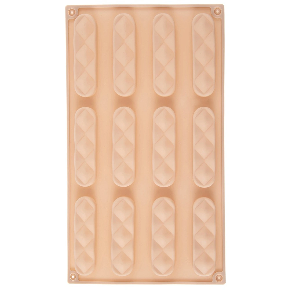 De vorm bevat twaalf langwerpige holtes, ideaal voor gelijkmatige koekjes of repen met een uniforme afmeting.