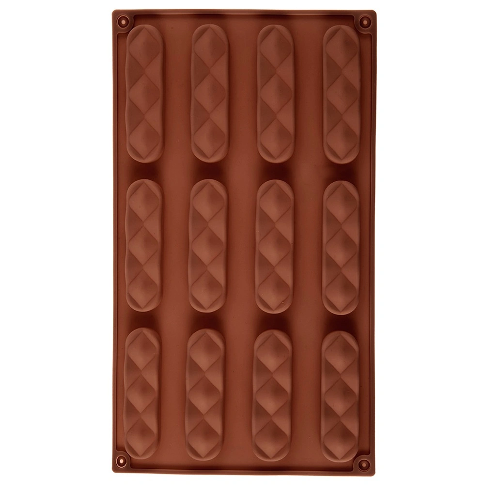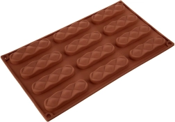 De vorm heeft twaalf langwerpige holtes met een decoratief patroon, waarmee je in één batch uniforme en esthetische koekjes of pralines maakt.