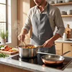 Ontdek betrouwbare bescherming tijdens het koken met een kwalitatief katoenen schort in een universele pasvorm voor dames en heren. De stof van 100% katoen is comfortabel, duurzaam en gemakkelijk wasbaar tot 40 °C, zodat het schort lang als nieuw blijft. De verstelbare riem met gesp maakt snelle en nauwkeurige afstelling van de lengte rond de nek mogelijk.
