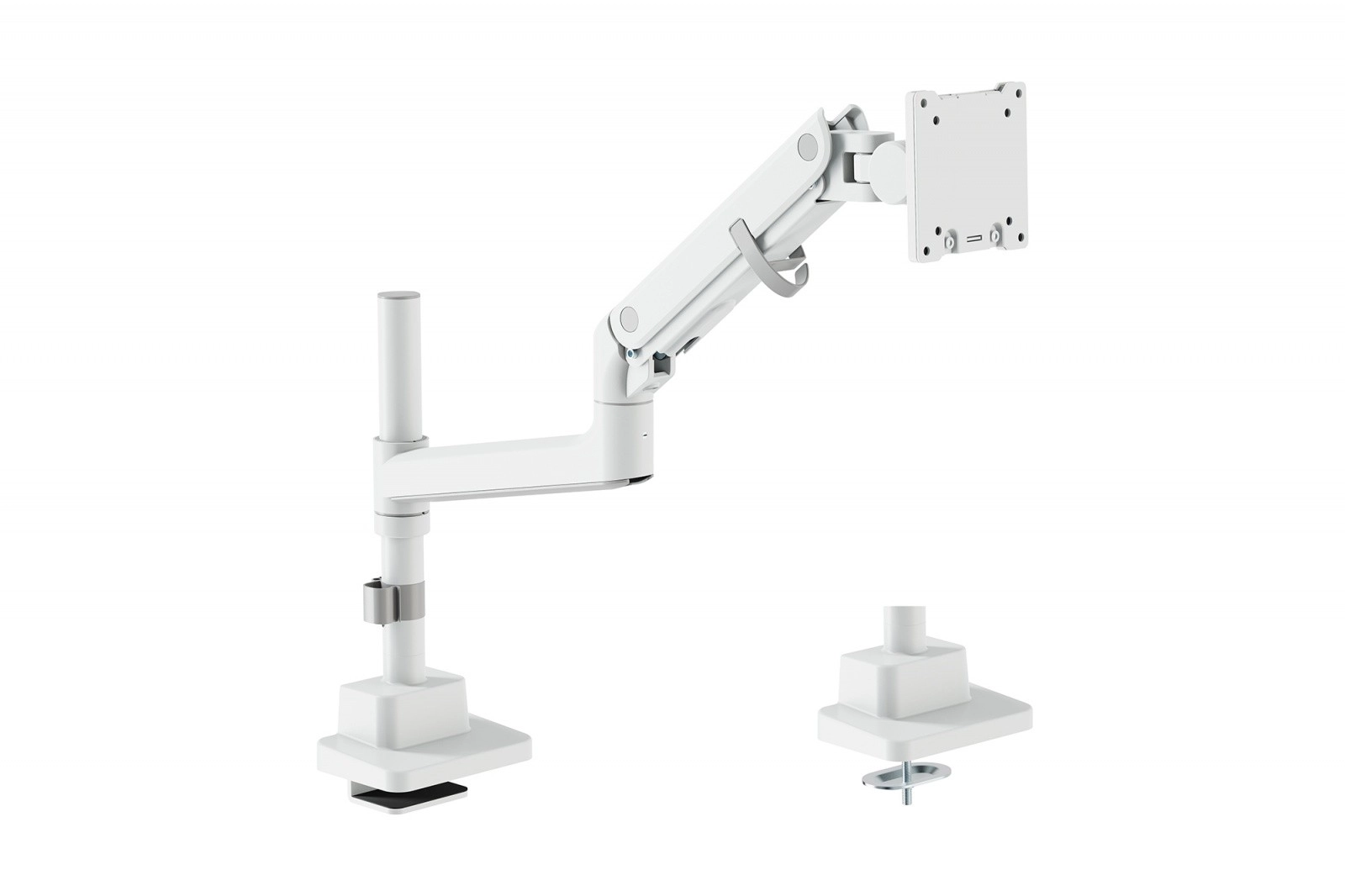 Premium witte monitorarm met een gasveer voor schermen tot 57" en 27 kg. Biedt een ruim bewegingsbereik, soepele hoogteverstelling, kantelen en roteren, VESA quick-release voor eenvoudige montage en een opgeruimd bureau dankzij de geïntegreerde kabelmanagement.