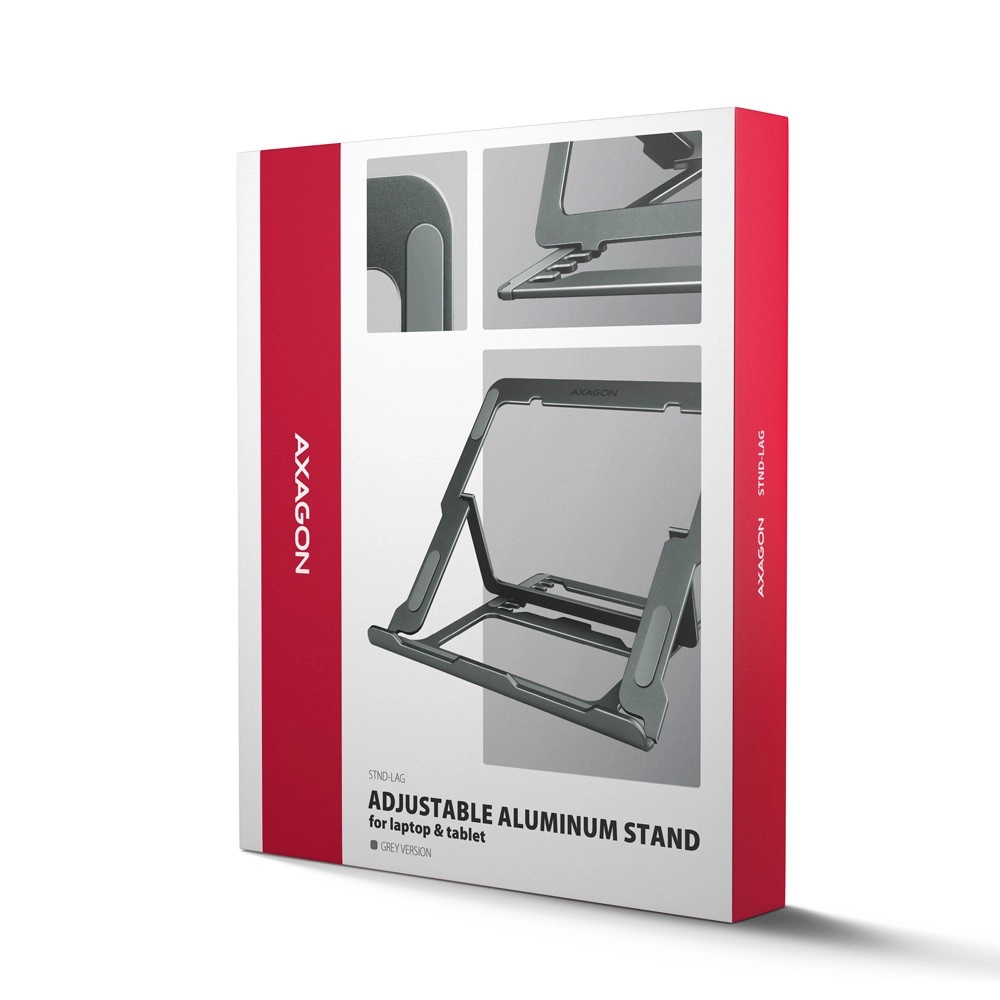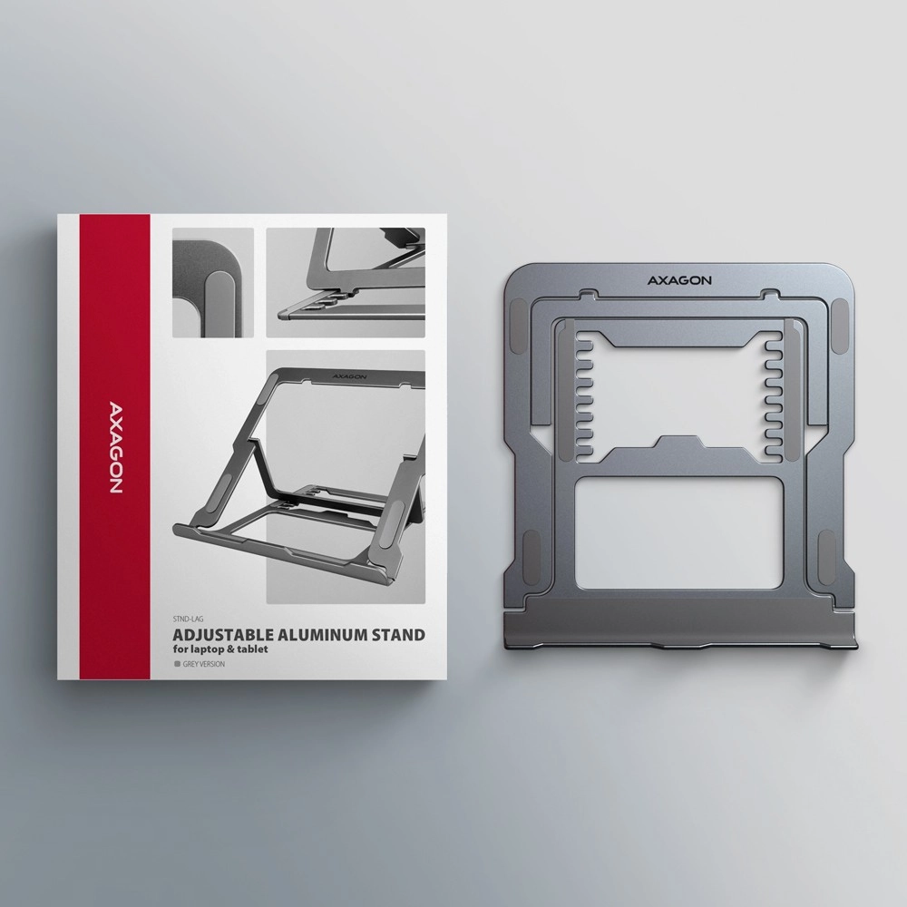 De universele aluminium laptop- en tabletstandaard van AXAGON biedt ergonomische verhoging van het scherm, 8 verstelbare posities en een stabiele metalen constructie met antislipoppervlak. Geschikt voor apparaten van 10" tot 17,3", verbetert je zithouding, ontlast de nek en ondersteunt betere koeling van je laptop.
