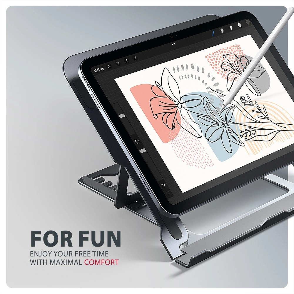 De standaard is bedoeld voor laptops en tablets met een schermdiagonaal van 10–17,3" en kan tot 20 kg dragen. De open constructie bevordert efficiënte warmteafvoer, wat bijdraagt aan hogere prestaties en een langere levensduur van je apparaat. De elegante grijze afwerking past perfect op elk bureau, thuis, op kantoor en onderweg.