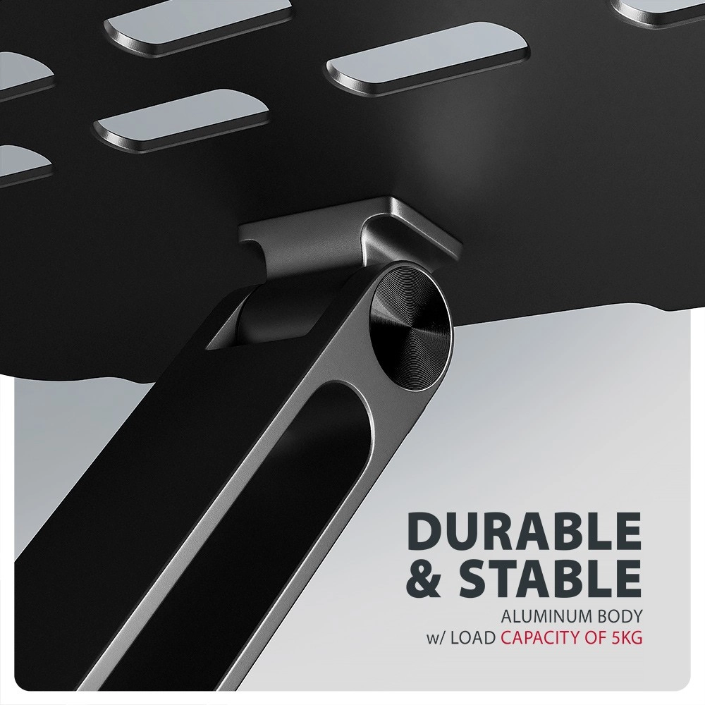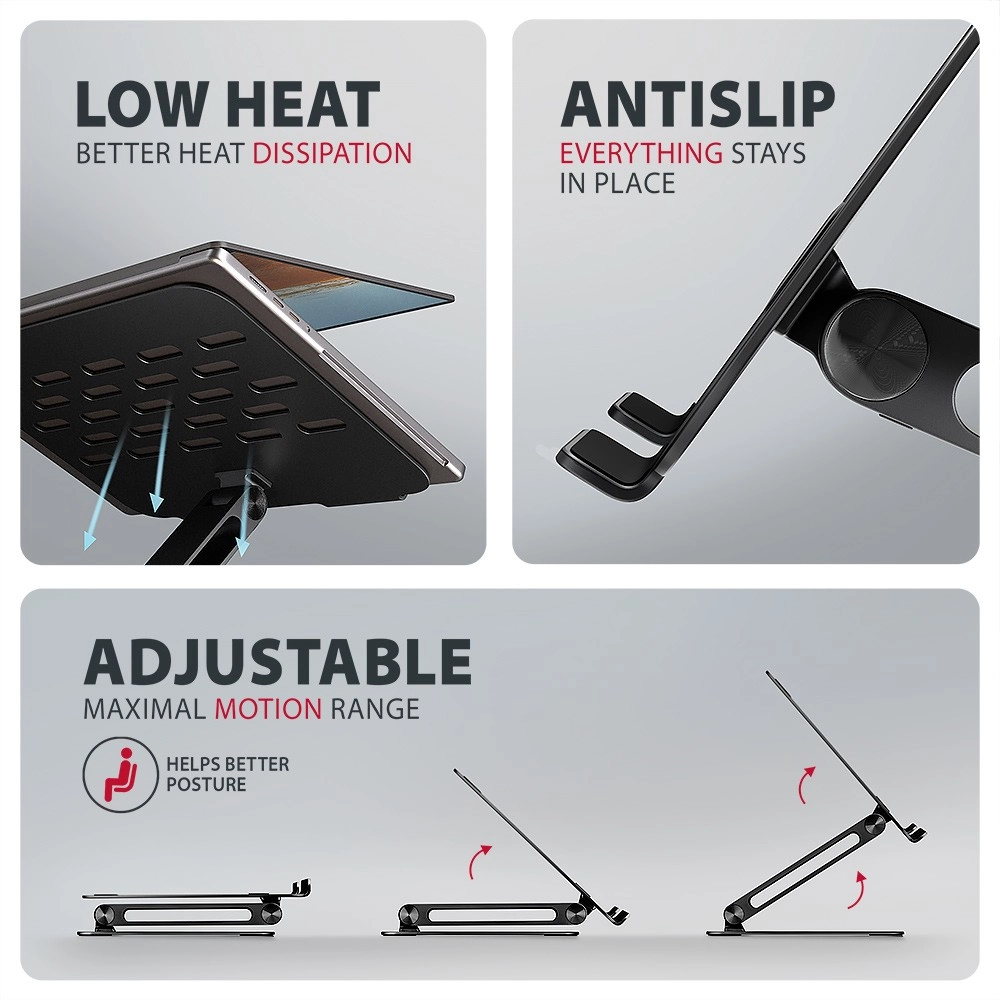 Doordachte ventilatieopeningen verbeteren de luchtstroom en de koeling van de laptop, wat zowel de prestaties als de levensduur ondersteunt. Dankzij de compacte afmetingen in opgevouwen toestand en de elegante zwarte uitvoering past de standaard op elk bureau en is hij ook ideaal voor onderweg.