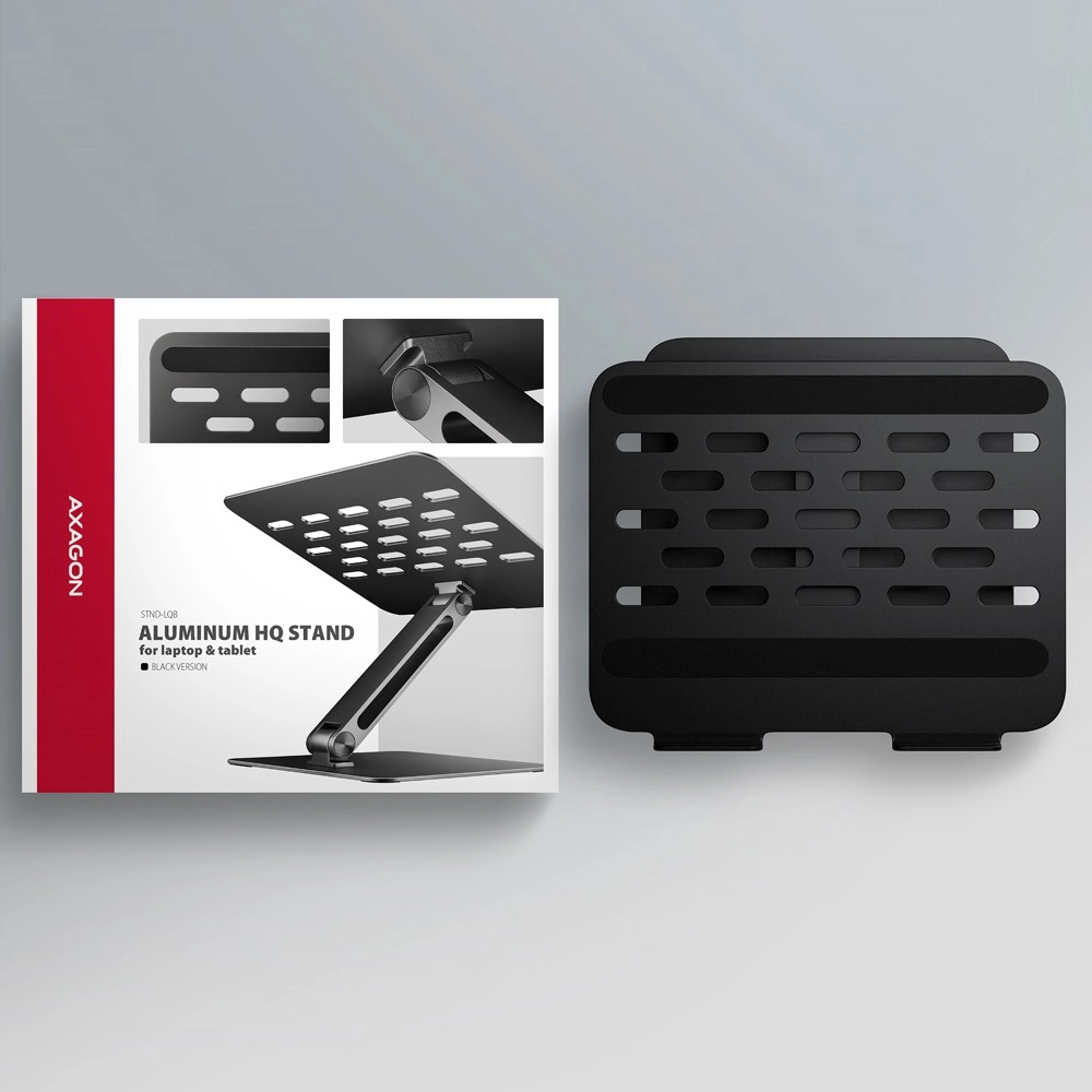 De AXAGON laptopstandaard is gemaakt van duurzame aluminium gietstukken voor een lange levensduur en stabiliteit. Het dubbele scharniermechanisme maakt het mogelijk om de hoogte tot 205 mm en de kantelhoek nauwkeurig in te stellen, zodat je de laptop eenvoudig kunt uitlijnen met een extern scherm en een comfortabele nek- en rughouding bereikt. Antislipopervlakken houden het apparaat stevig vast en beschermen tegelijk tegen krassen.