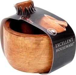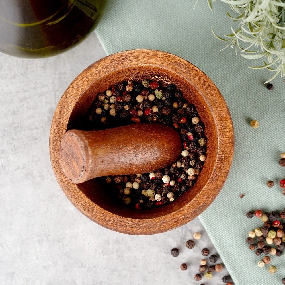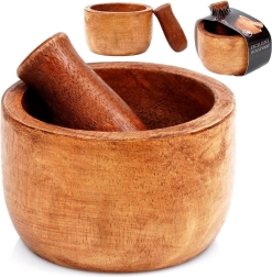 Praktische houten vijzel van mangohout met ergonomische stamper voor het eenvoudig pletten van kruiden, specerijen en zaden. Biedt een stevige constructie, bestandheid tegen vocht en vervorming en een natuurlijke uitstraling, waardoor het zowel een handige hulp als een stijlvol accessoire is voor elke keuken.