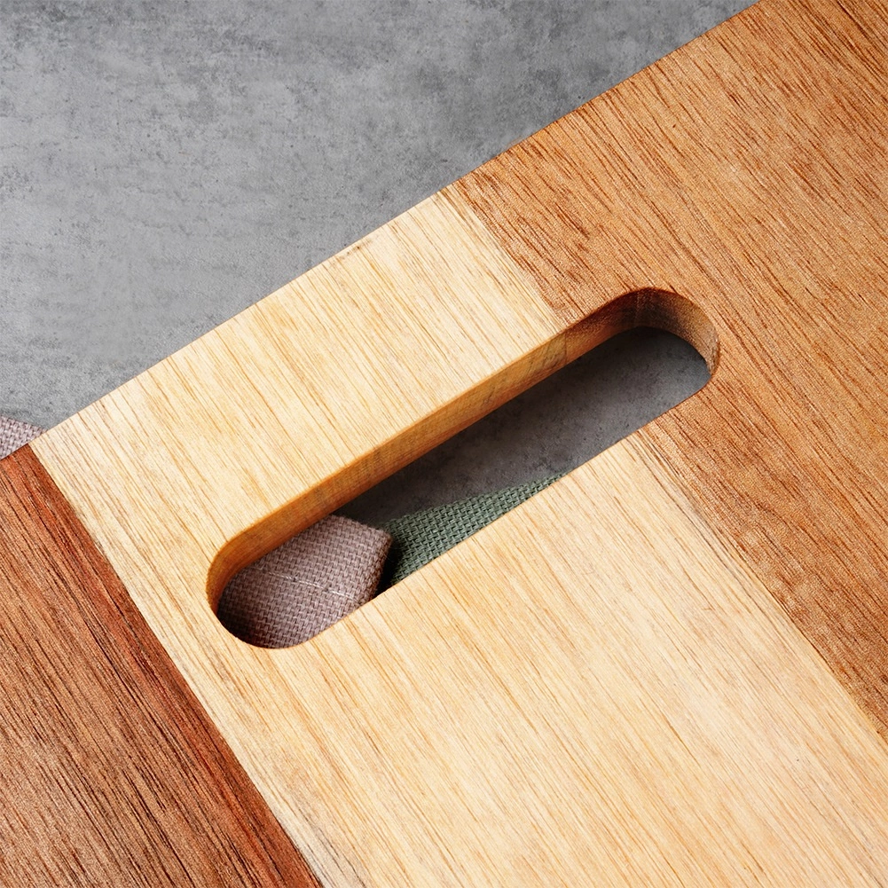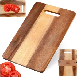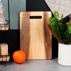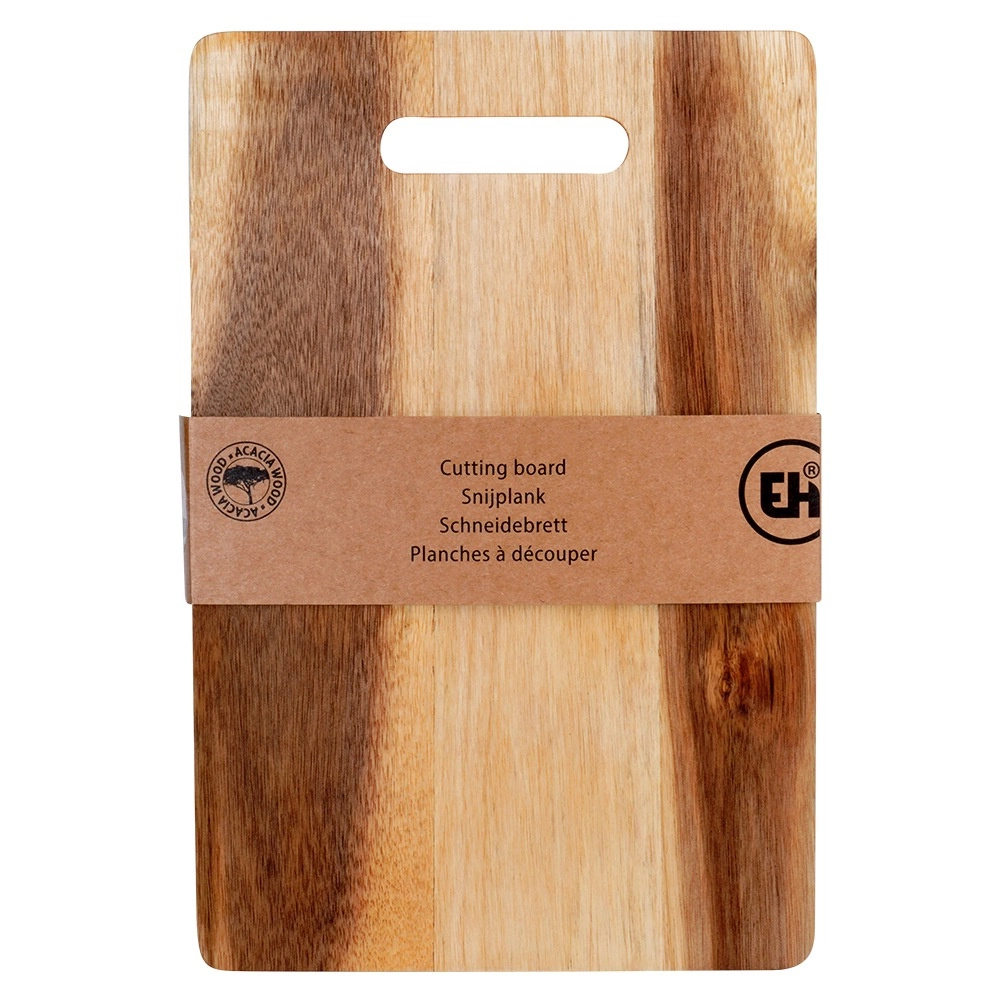 Praktische en stijlvolle houten snijplank van acaciahout met afmetingen 30 × 20 cm en een dikte van 1 cm, ideaal voor dagelijks snijden én serveren. Biedt een stevig en duurzaam oppervlak, natuurlijke vochtbestendigheid en een ergonomische handgreep voor eenvoudig dragen. Perfect voor gebruik in de keuken en voor het elegant presenteren van kazen, vleeswaren en snacks.