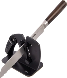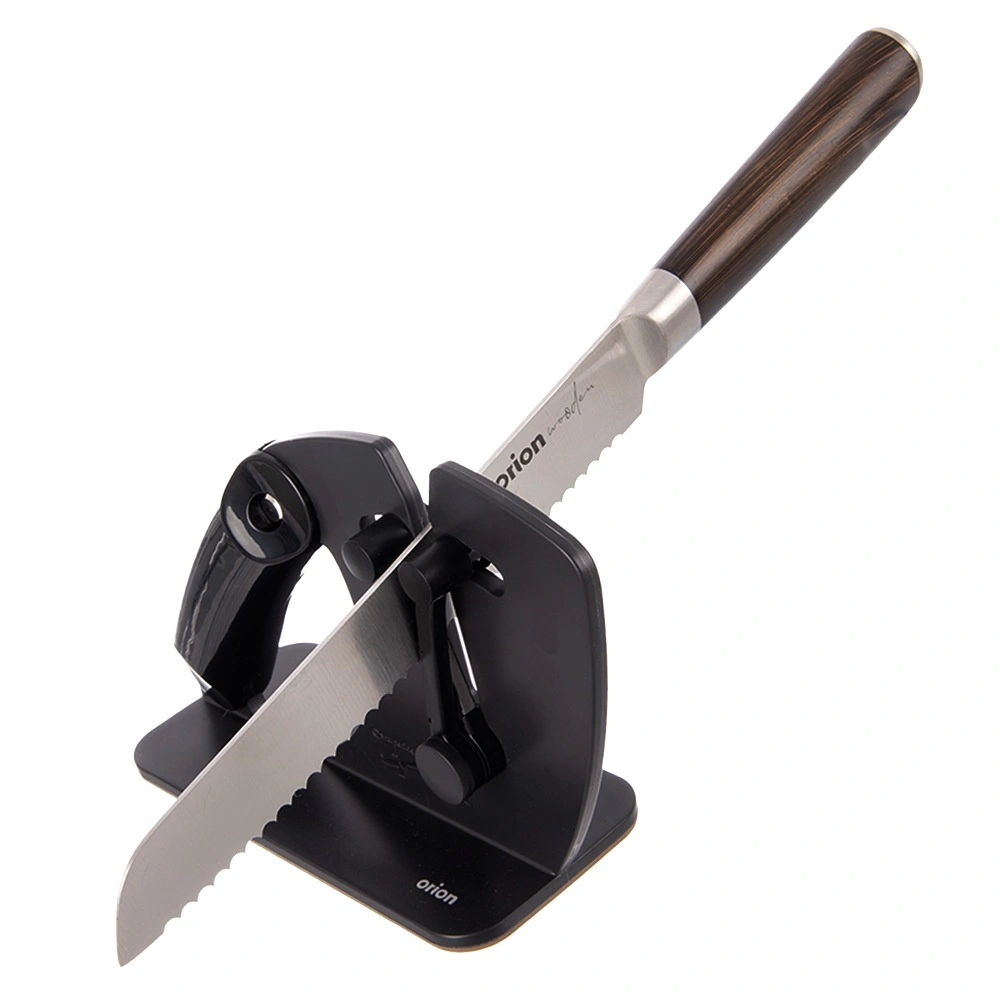 Het veermechanisme past zich automatisch aan het lemmet aan en behoudt de juiste hoek voor consistent en zorgvuldig slijpen van zowel rechte als gekartelde messen.