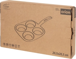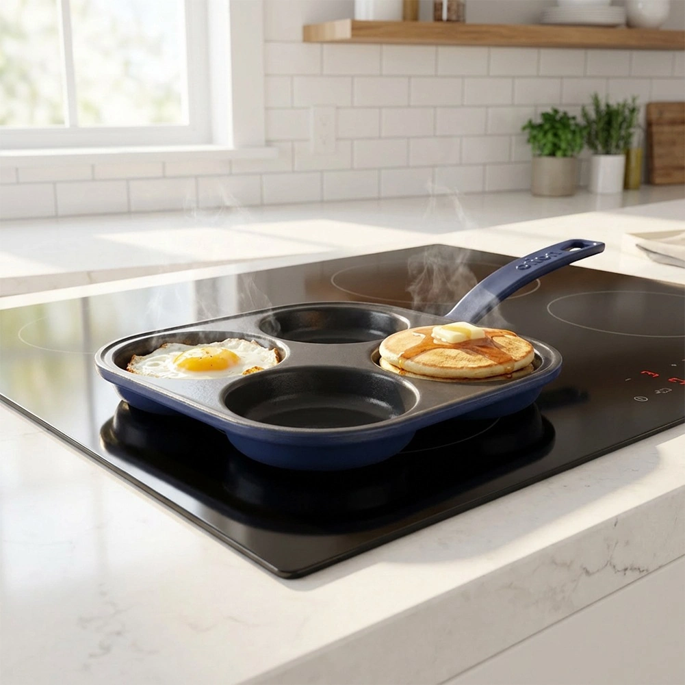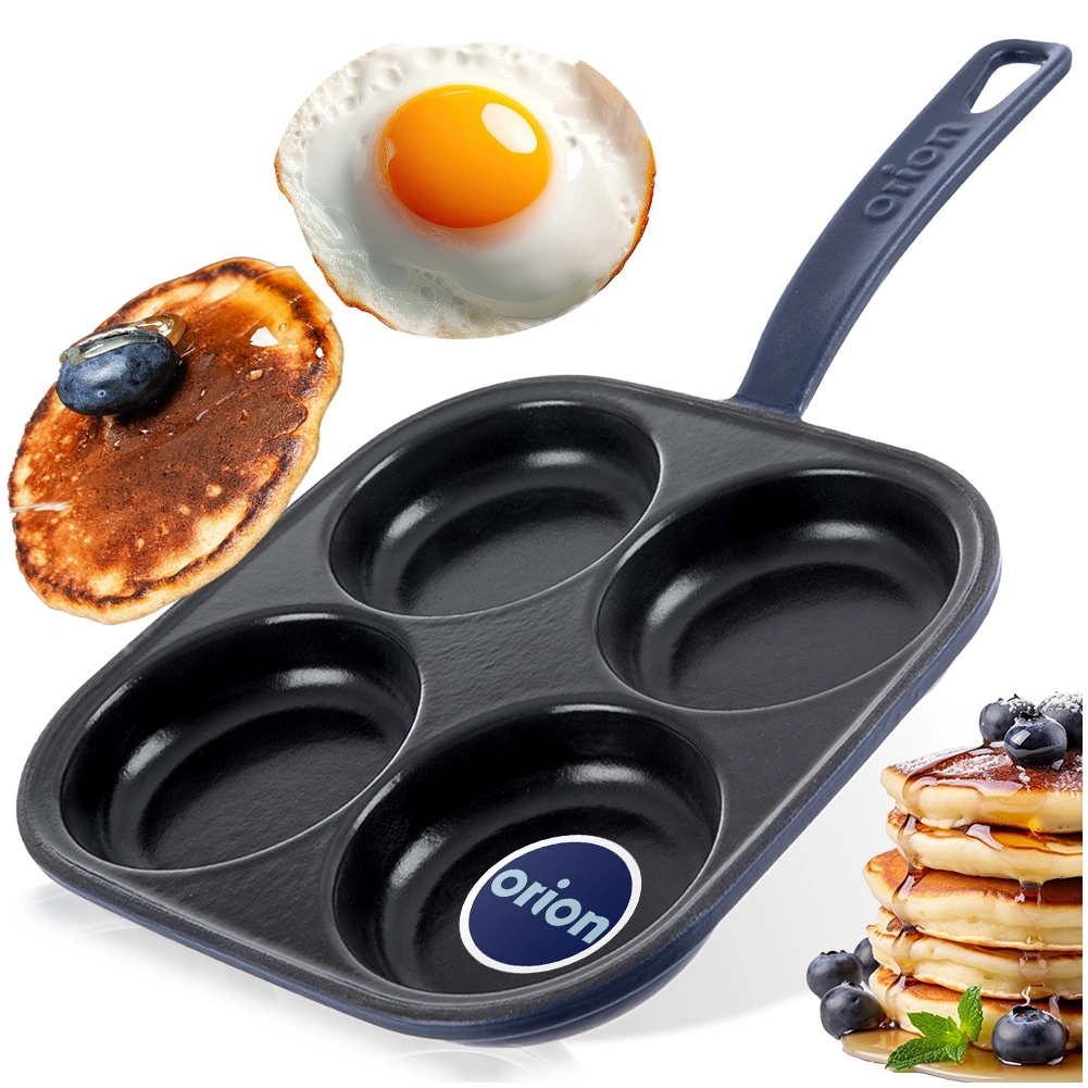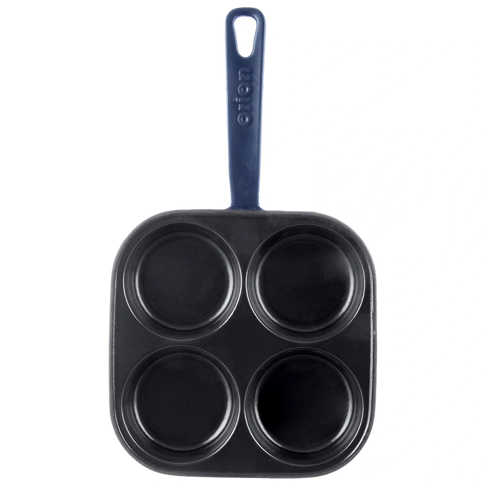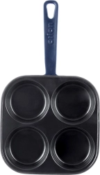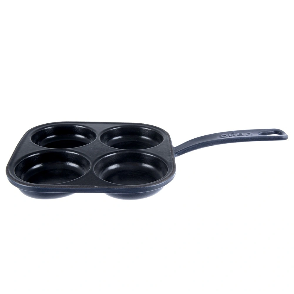 Vierkante gietijzeren pan met afmetingen 20,5 × 20,5 cm en vier gescheiden cupjes (Ø 9 cm) voor snelle bereiding van eieren, pannenkoekjes en mini-crêpes in een perfecte vorm. Het geëmailleerde oppervlak in zwart minimaliseert aanbranden en maakt serveren eenvoudiger; de buitenzijde en handgreep in een blauwe tint geven de pan een elegante uitstraling.
