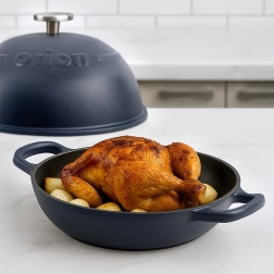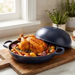 Deze geëmailleerde gietijzeren vorm met deksel is ideaal voor knapperig huisgemaakt brood, goudbruin geroosterde kip en sappige braadstukken. Het onderste deel dient als ruime gietijzeren pan, terwijl het hoge deksel zorgt voor gelijkmatige warmtecirculatie en zacht stoven.