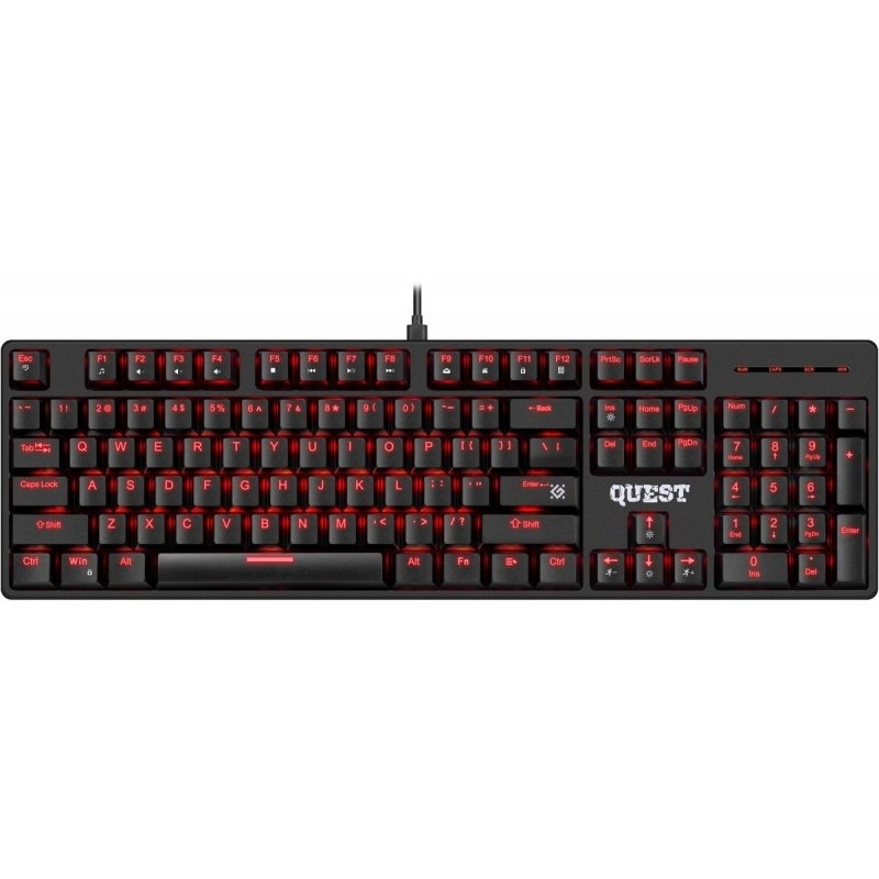 Volwaardig mechanisch gamingtoetsenbord QUEST GK‑1596 met heldere rode verlichting, rode switches voor snelle respons en anti‑ghosting voor nauwkeurige en soepele bediening tijdens het gamen.