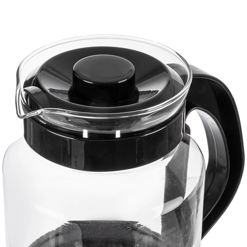 De kan is gemaakt van borosilicaatglas dat bestand is tegen hoge temperaturen, aangevuld met een comfortabel kunststof handvat en een deksel in het zwart. Dankzij de doordachte schenktuit is schenken soepel en druppelvrij, en het ergonomische handvat zorgt voor een zekere grip zonder risico op verbranding.