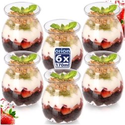 Stijlvolle set van zes transparante bekers van 160 ml, ideaal voor het serveren van yoghurt, mousse, panna cotta, tiramisu en hartige snacks. Dankzij de minimalistische vorm en het heldere design komen laagjes van desserts, fruitsalades en miniporties prachtig tot hun recht. De bekers zijn meerdere keren te gebruiken en hittebestendig tot 60 °C, perfect voor feesten, banketten en catering.