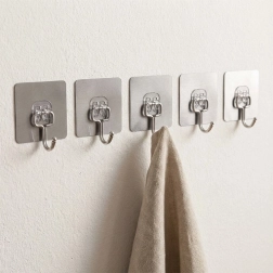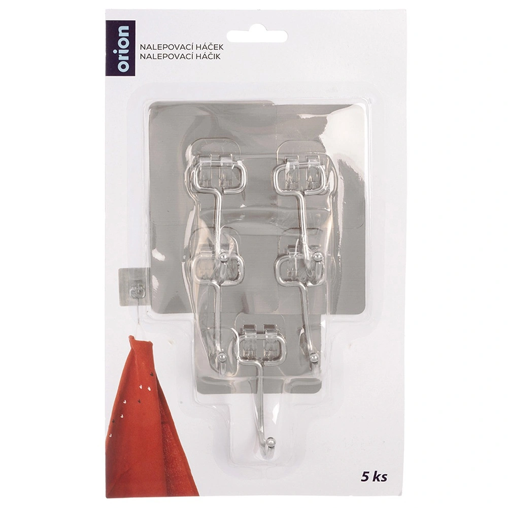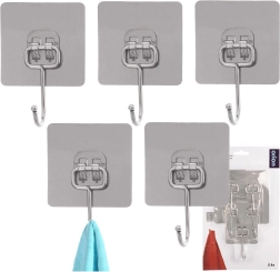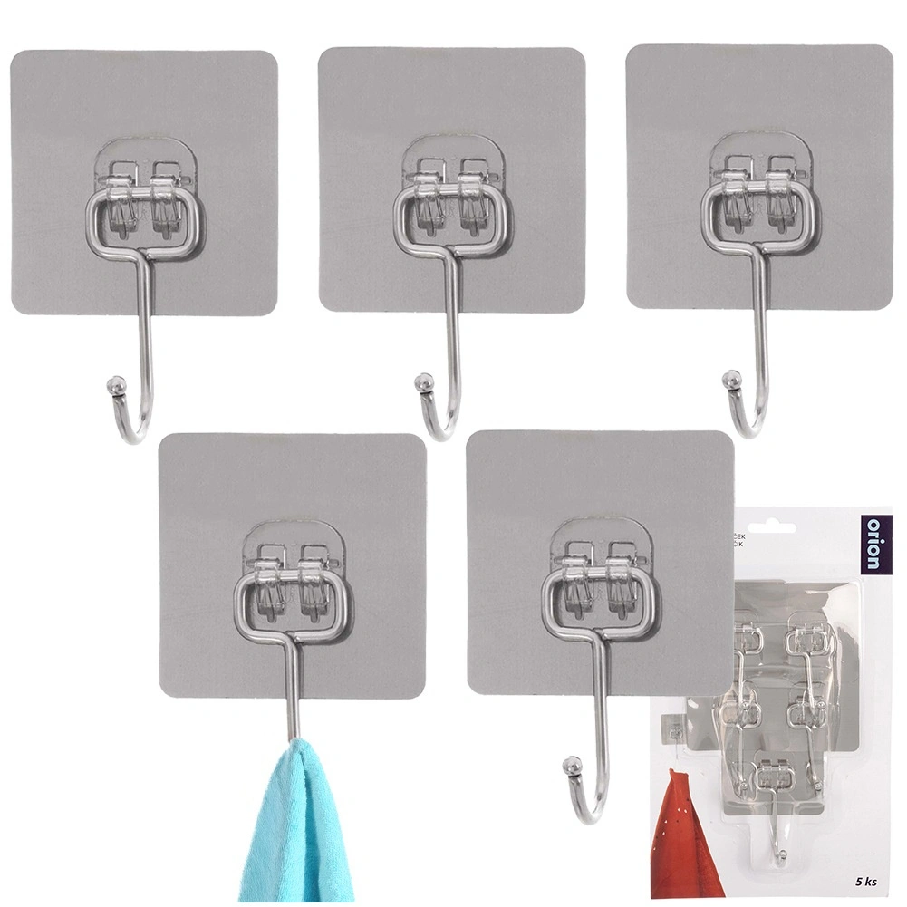 Praktische set van vijf zelfklevende haakjes voor elk huishouden. Dankzij de sterke hechting blijven ze stevig zitten op gladde oppervlakken zonder te boren. Gemaakt van duurzaam roestvrij staal, ideaal voor in de keuken en badkamer voor handdoeken, theedoeken, badjassen of sleutels. Eenvoudige installatie – ontvetten, aandrukken en klaar.