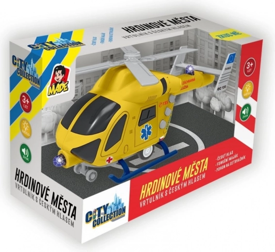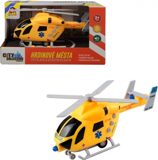 Maak thuis je eigen helihaven en ga op reddingsmissies met de gedetailleerde helikopter uit de City Collection – Helden van de Stad. Dit model in Tsjechisch design biedt authentieke licht- en geluidseffecten, inclusief een Tsjechisch gesprek tussen meldkamer en piloot, wat de spelbeleving versterkt.