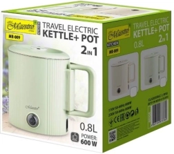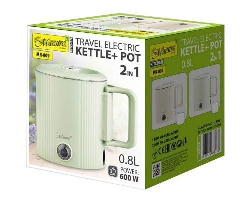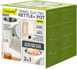 De compacte 2-in-1 reiswaterkoker en pan MAESTRO MR-009 biedt een inhoud van 0,8 l, een vermogen van 600 W en een inklapbare handgreep voor eenvoudig meenemen. Dankzij de dubbelwandige constructie en de binnenzijde van roestvrij staal 304 verwarmt hij snel water én eten. Het dual voltage 110/230 V maakt hem ideaal voor reizen, kamperen en kantoor.