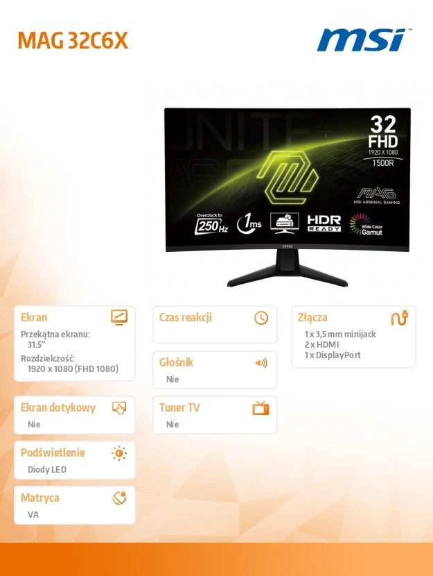 De MAG 32C6X combineert een groot 31,5" schermdiagonaal met een gebogen scherm voor een natuurlijker gezichtsveld en meer comfort bij zowel gamen als werken. De hoge verversingssnelheid van 250 Hz minimaliseert bewegingsonscherpte en levert een uitzonderlijk vloeiende visuele ervaring in shooters, races en esports-titels.
