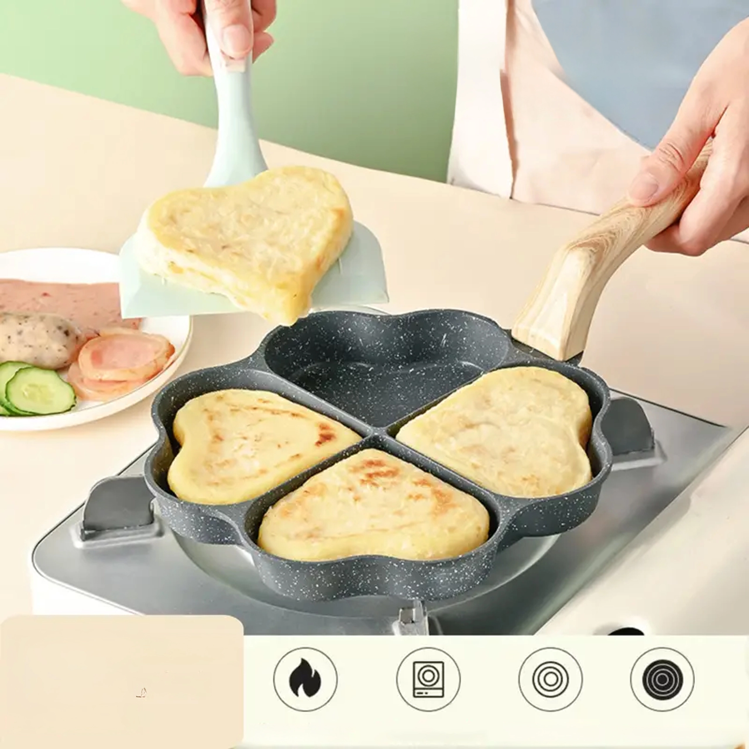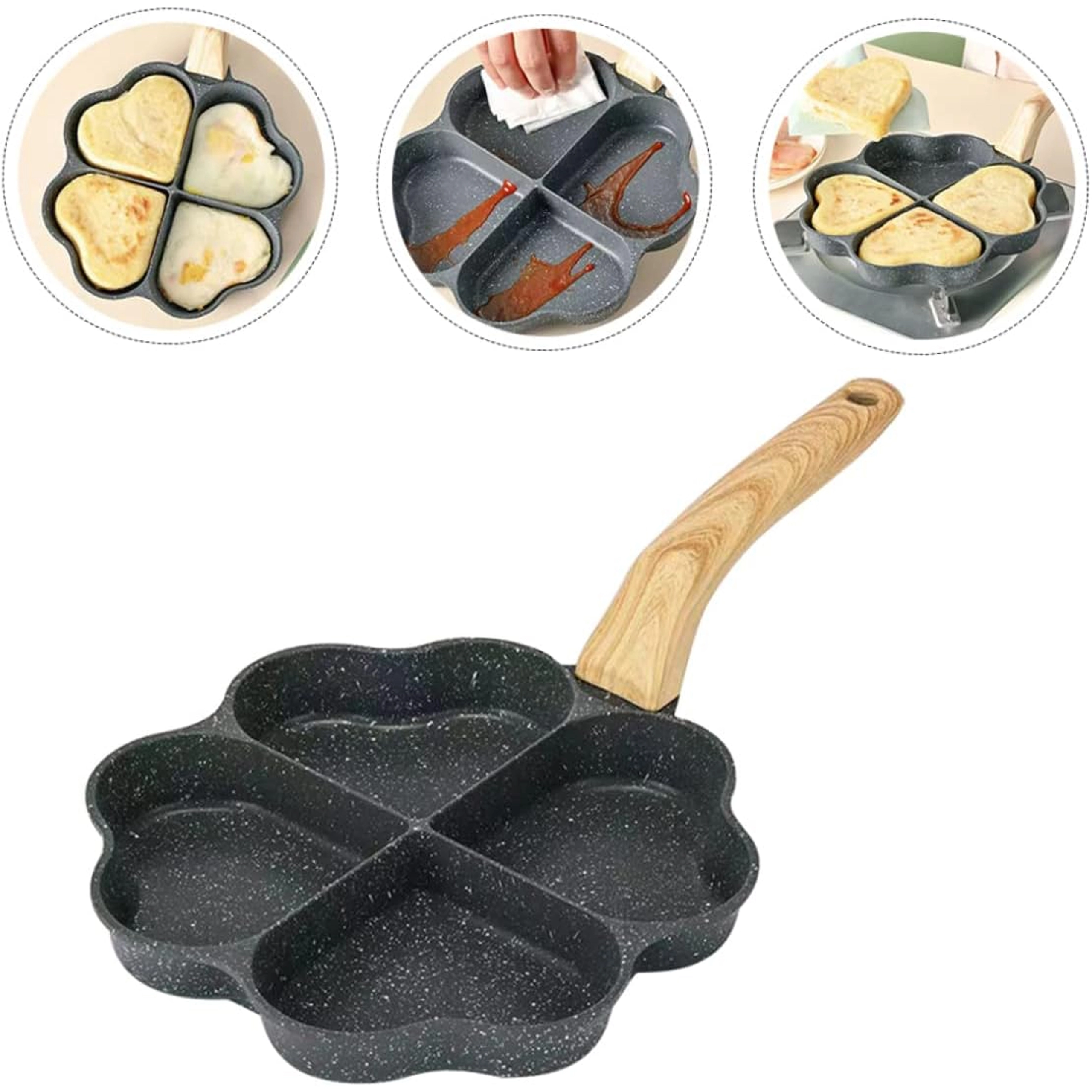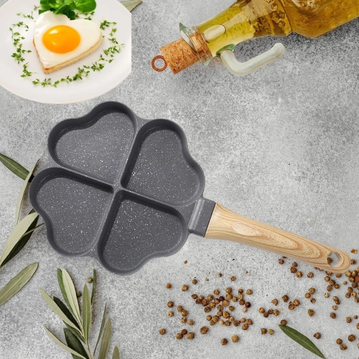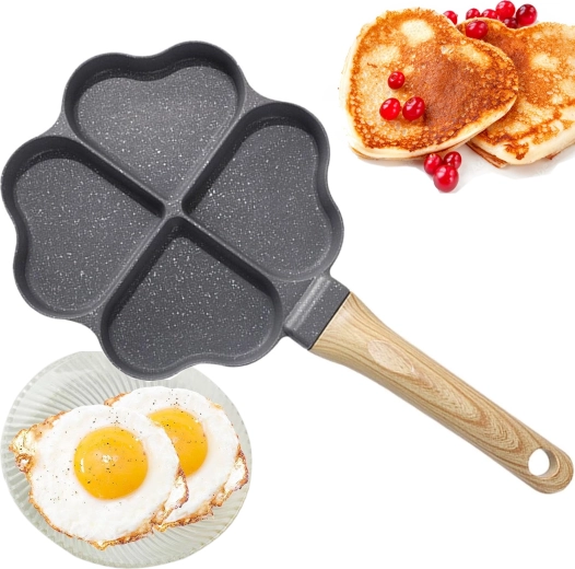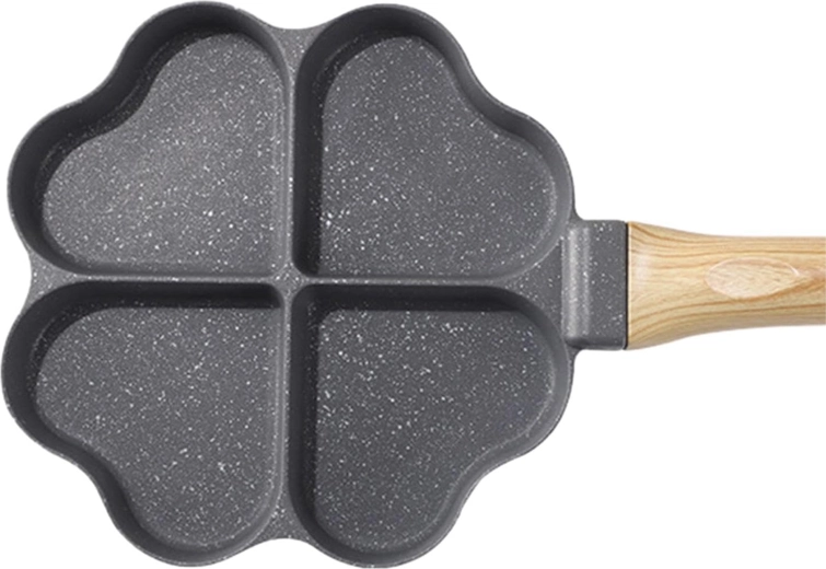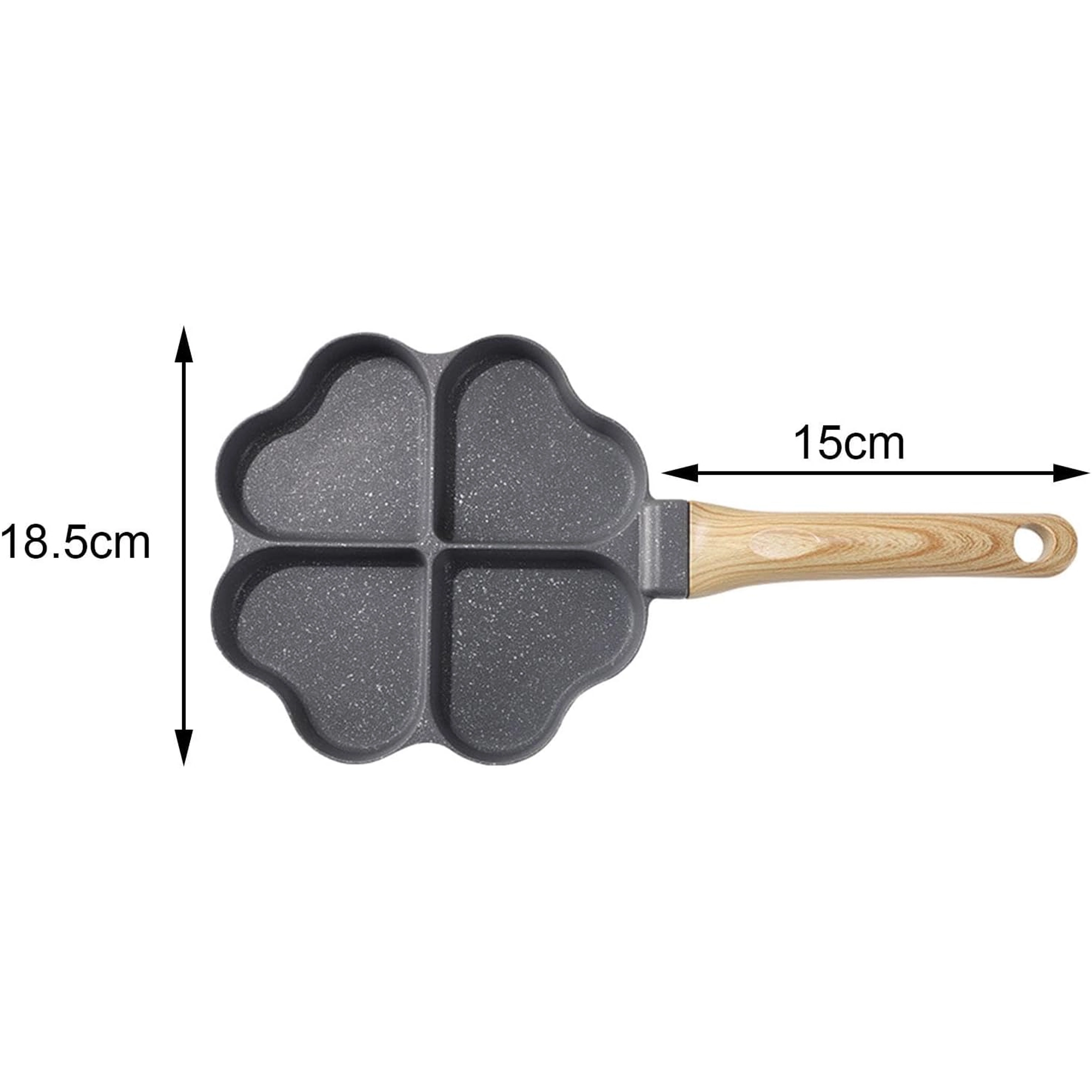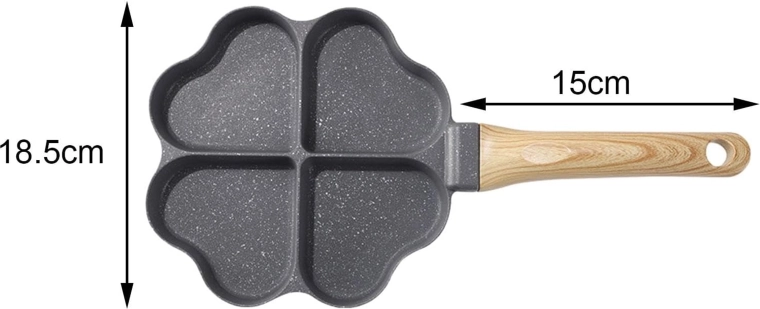 Deze vierdelige pan met hartvormige vakjes is ideaal voor het bereiden van gelijkmatige porties – pannenkoeken, eieren, aardappelkoekjes of mini-flapjes. De anti-aanbaklaag, gemakkelijk te reinigen zorgt voor schoon omdraaien en simpel schoonmaken, terwijl de gescheiden secties elke portie mooi in vorm houden.