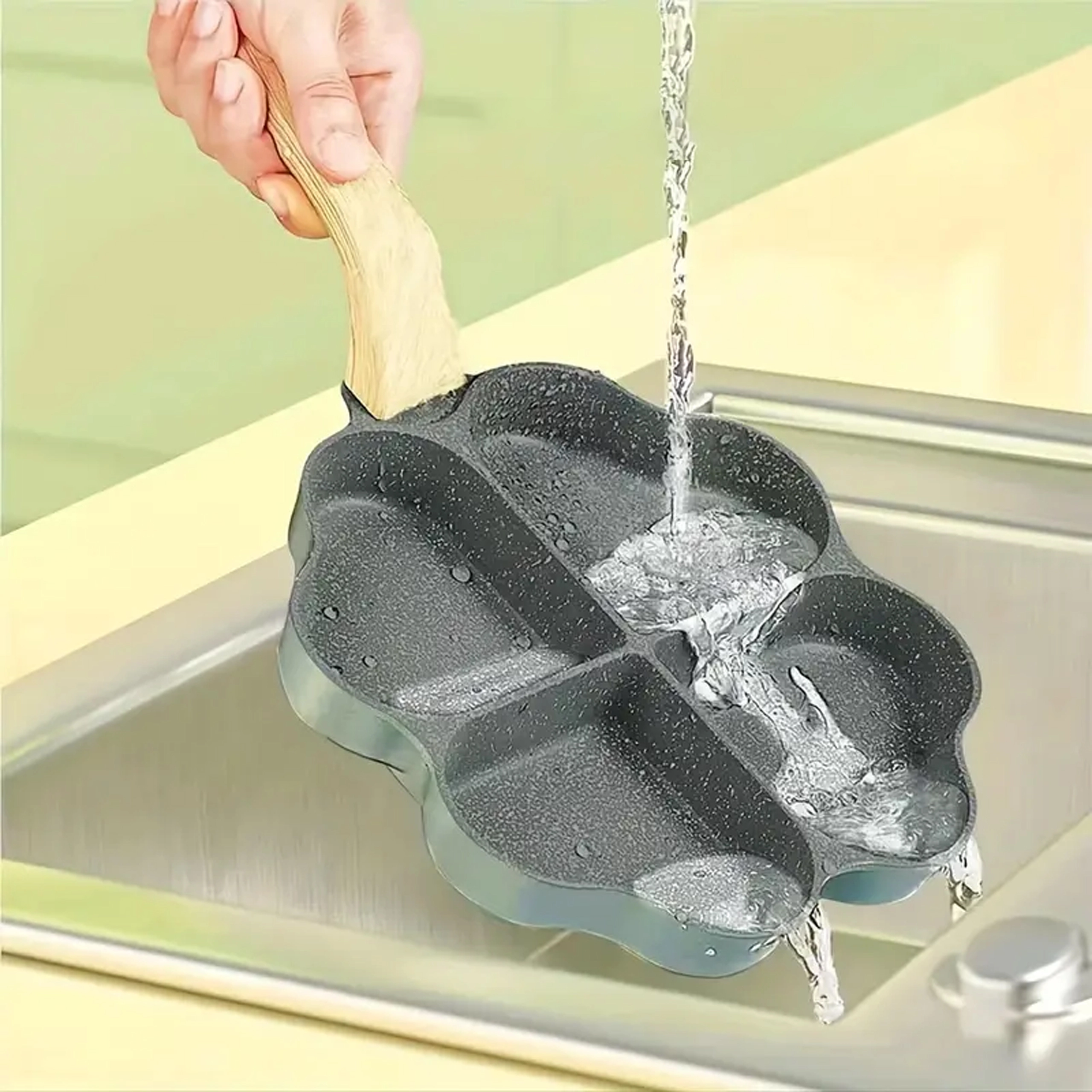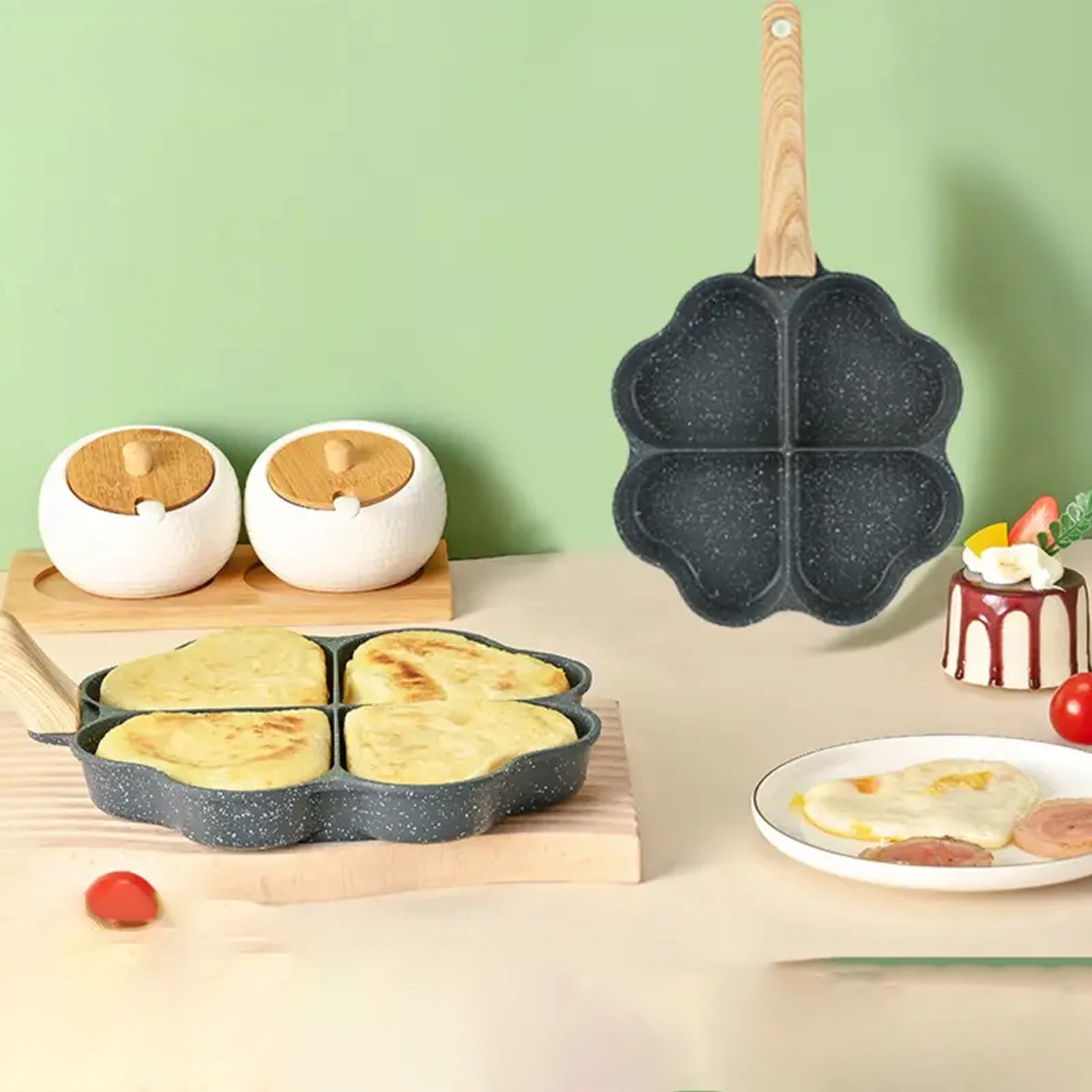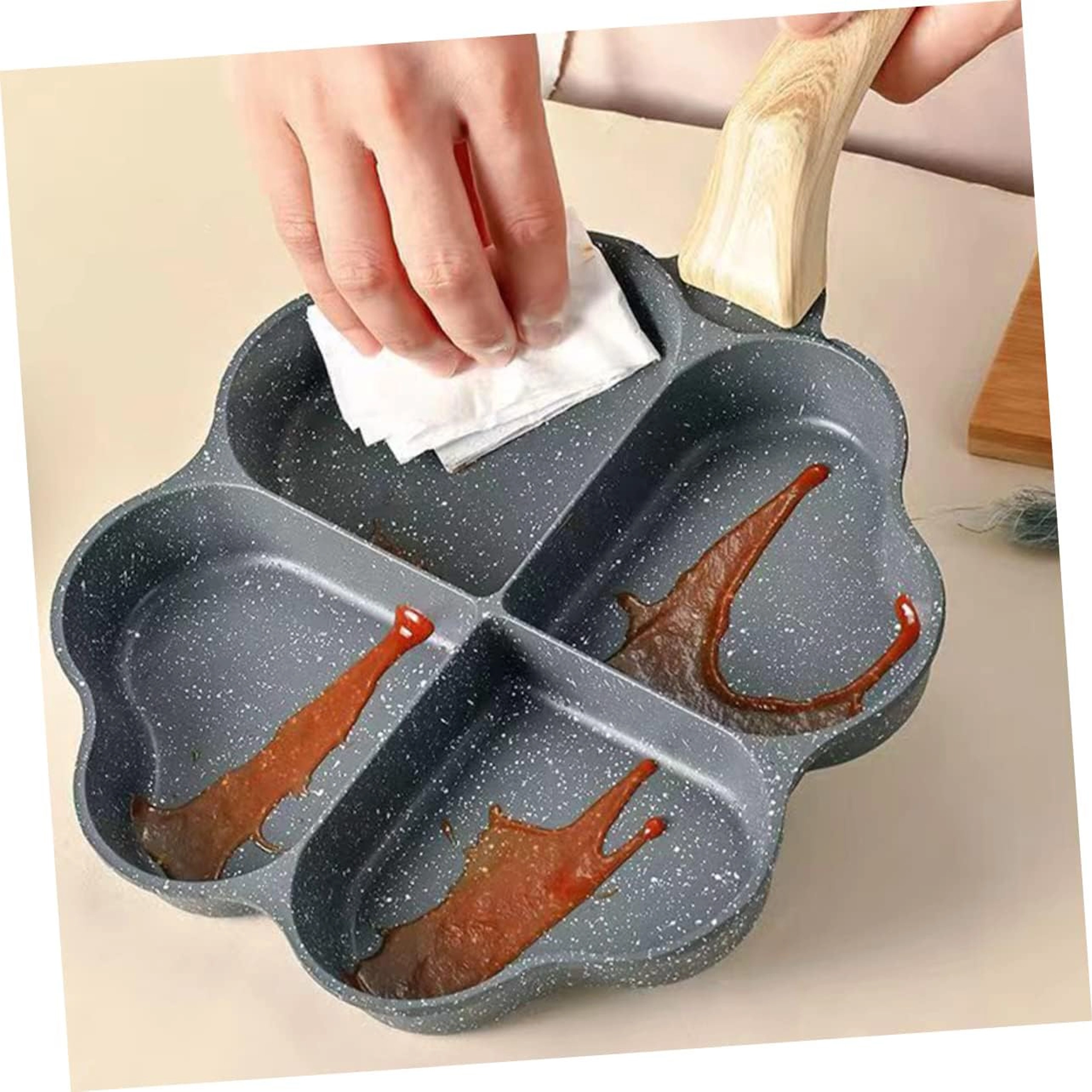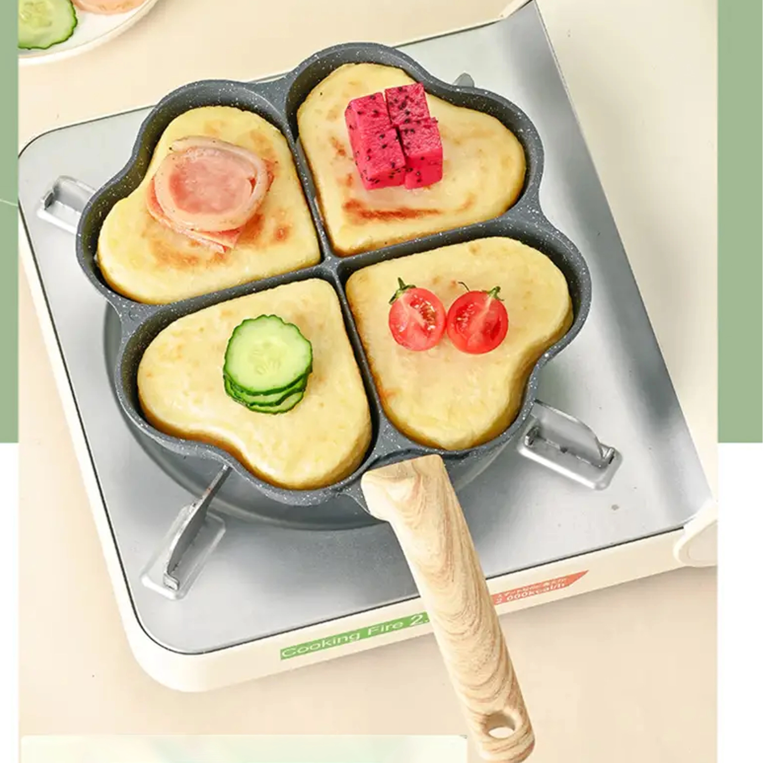 Deze vierdelige pan met hartvormige vakjes is ideaal voor het bereiden van gelijkmatige porties – pannenkoeken, eieren, aardappelkoekjes of mini-flapjes. De anti-aanbaklaag, gemakkelijk te reinigen zorgt voor schoon omdraaien en simpel schoonmaken, terwijl de gescheiden secties elke portie mooi in vorm houden.