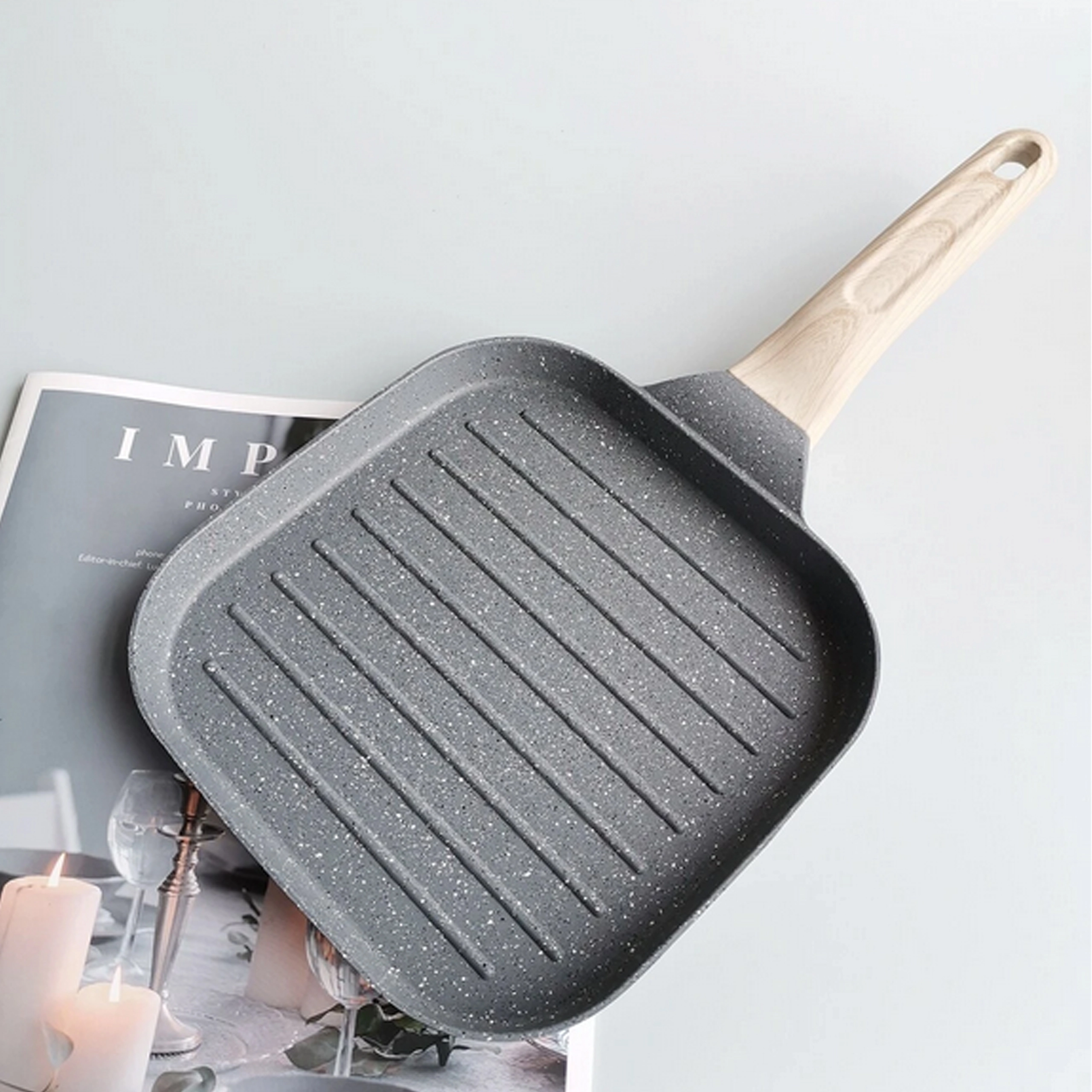 Deze veelzijdige grillpan is ideaal voor steaks, vis en groenten. De robuuste vierkante vorm biedt een groot bakoppervlak, terwijl de verhoogde ribbels zorgen voor intens contact met de warmte en mooie grillstrepen. De antiaanbaklaag maakt koken met minder olie mogelijk en vereenvoudigt het onderhoud.