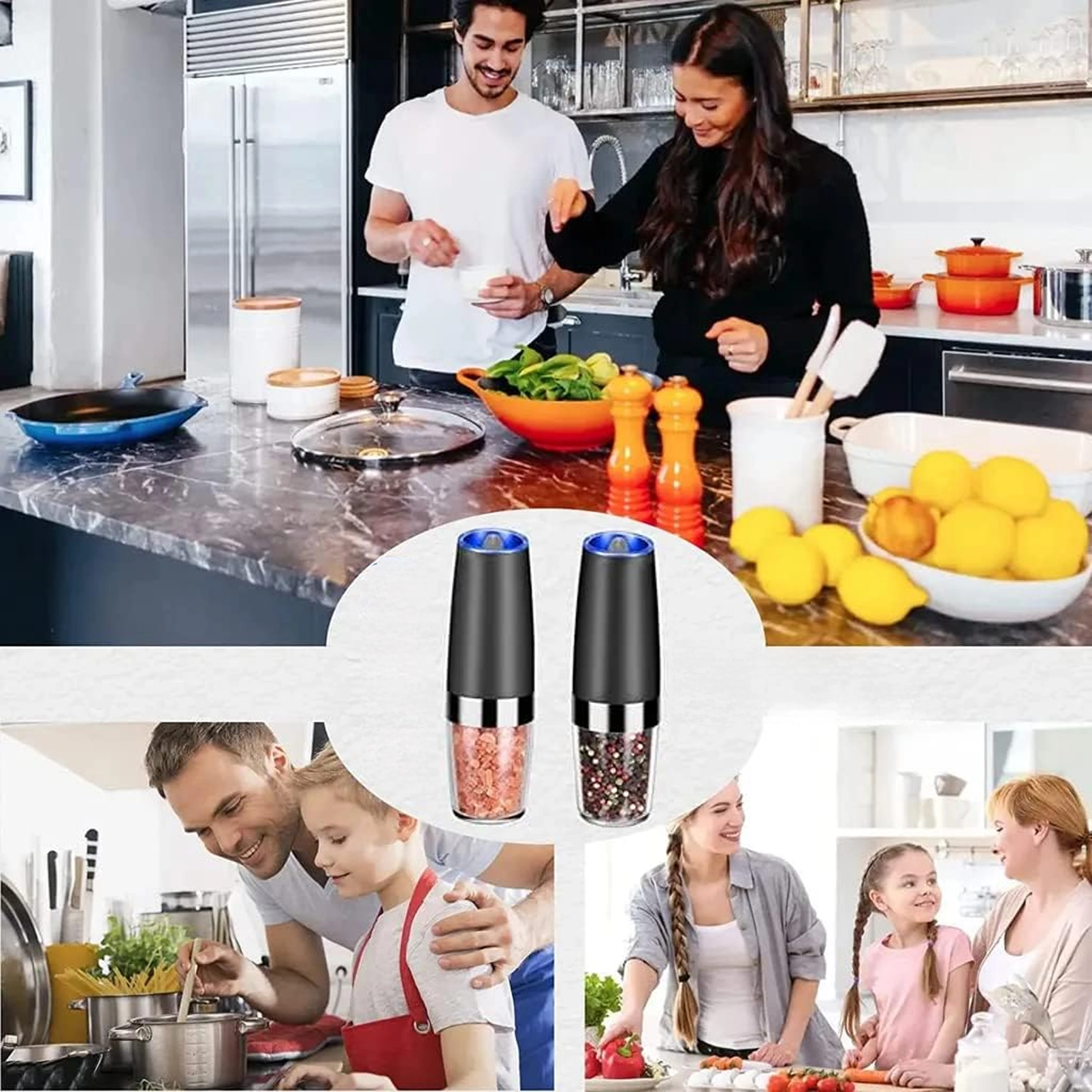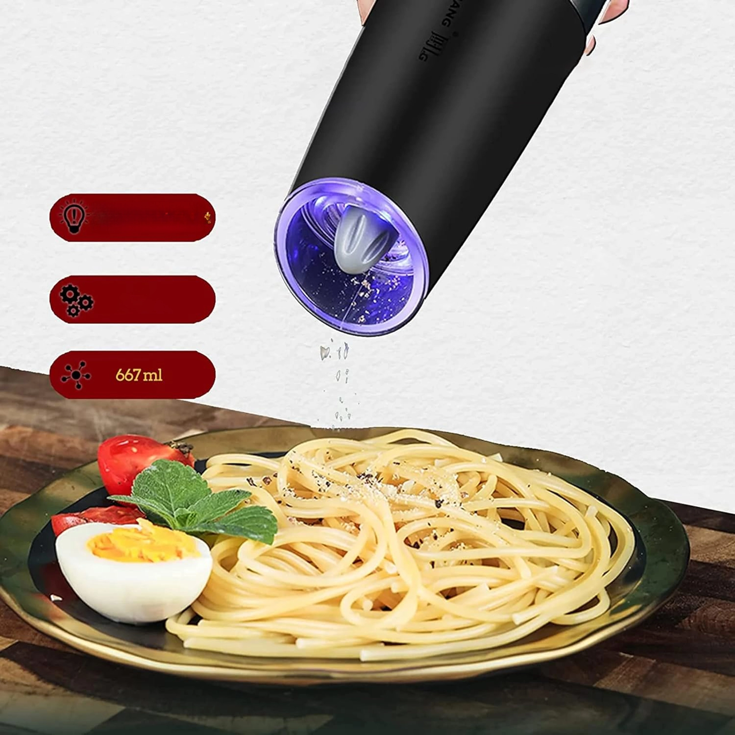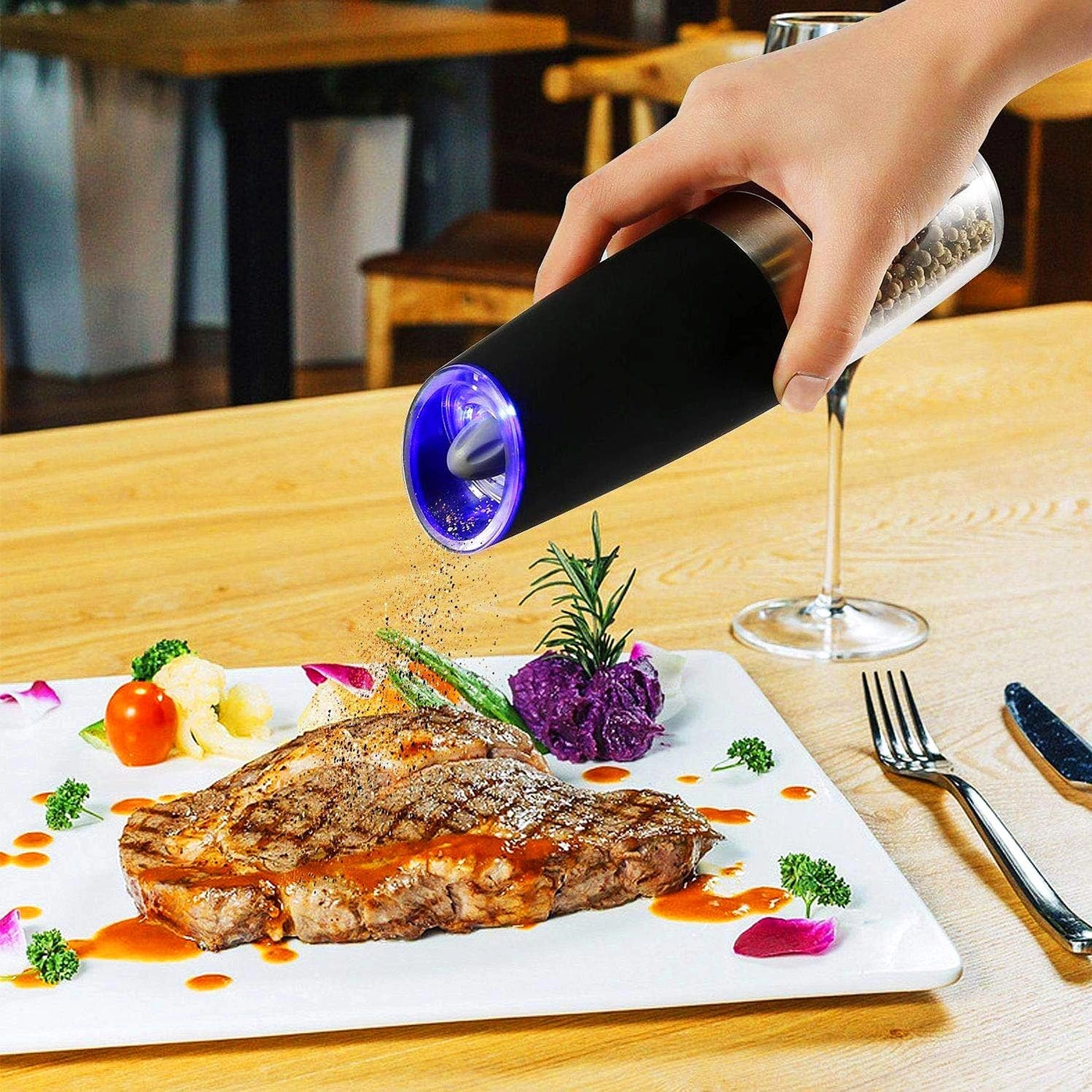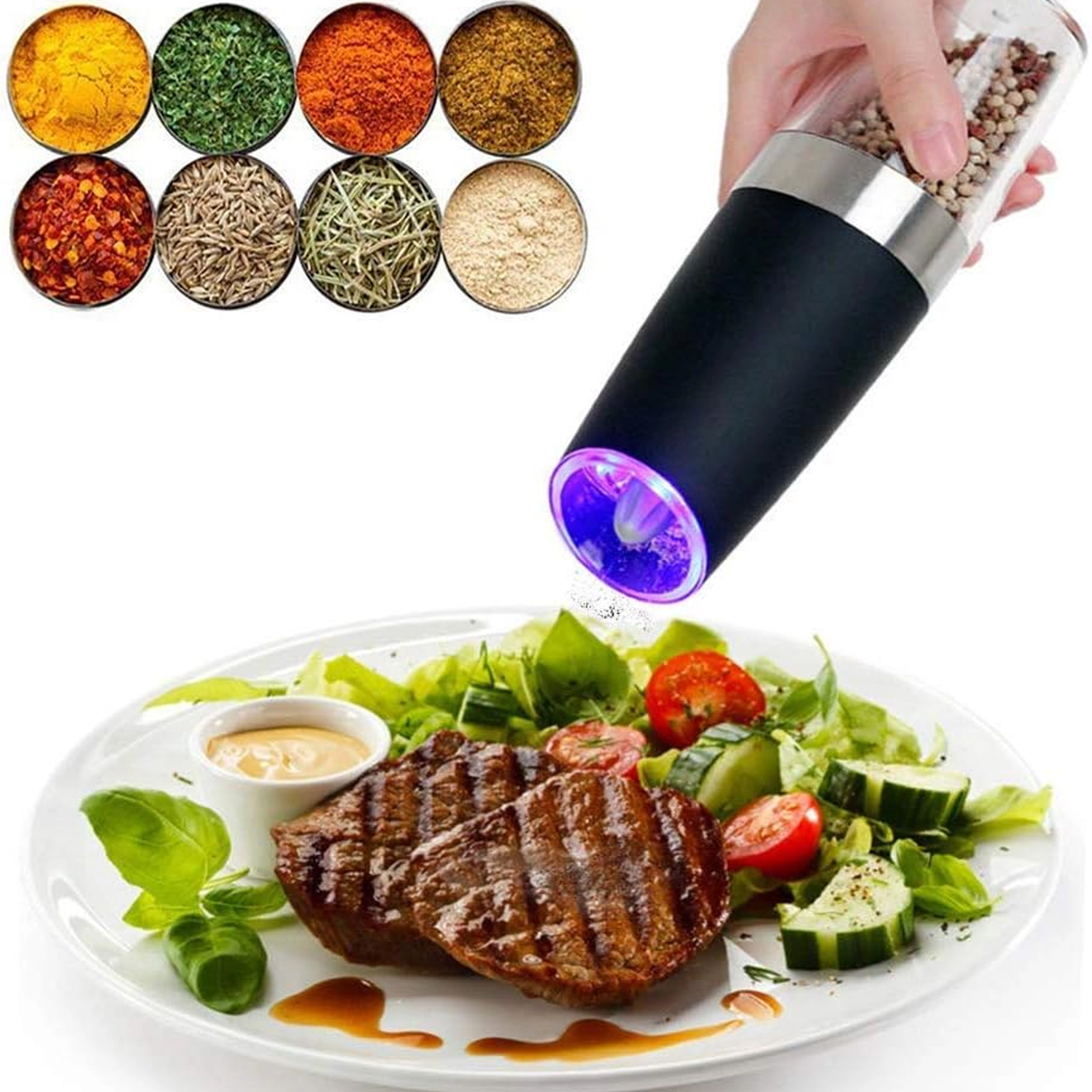 Ontdek het gemak van dagelijks kruiden met een set van twee elektrische zwaartekrachtmolens. Kantel ze en maal direct vers zout, peper of andere kruiden – zonder knoppen in te drukken. De transparante reservoirkamer voor eenvoudig zicht, instelbare maalgraad en geïntegreerde LED-verlichting voor nauwkeurige dosering maken deze molens tot een stijlvolle en praktische aanvulling voor elke keuken. Automatisch malen, bediening met één hand, LED-licht en modern design voor op het aanrecht.