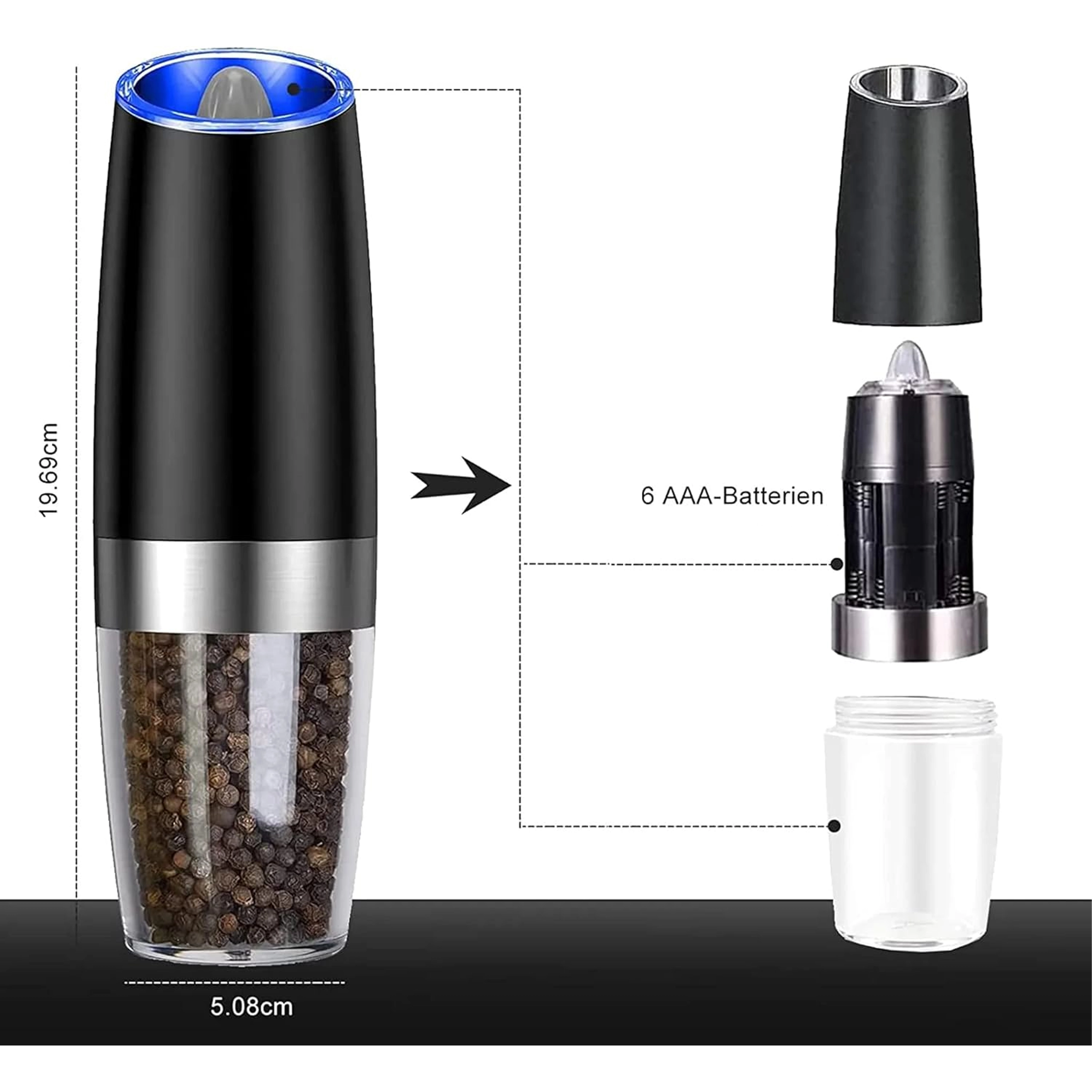 Geïntegreerd blauw LED-licht verlicht de portie tijdens het malen, zodat je de hoeveelheid kruiden ook bij schemering goed ziet.