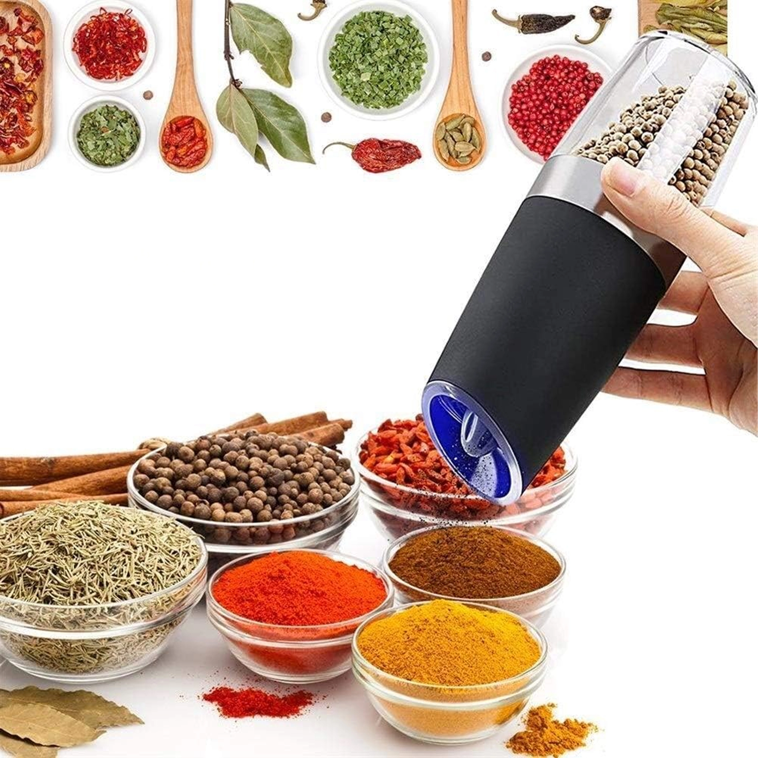 De set bevat twee elektrische molens met zwaartekrachtactivatie – de kruiden beginnen automatisch te malen wanneer je de molen boven het gerecht kantelt. Dankzij het transparante reservoir heb je altijd zicht op de inhoud en met de instelbare maalgraad wissel je eenvoudig van fijn poeder naar grovere stukjes.