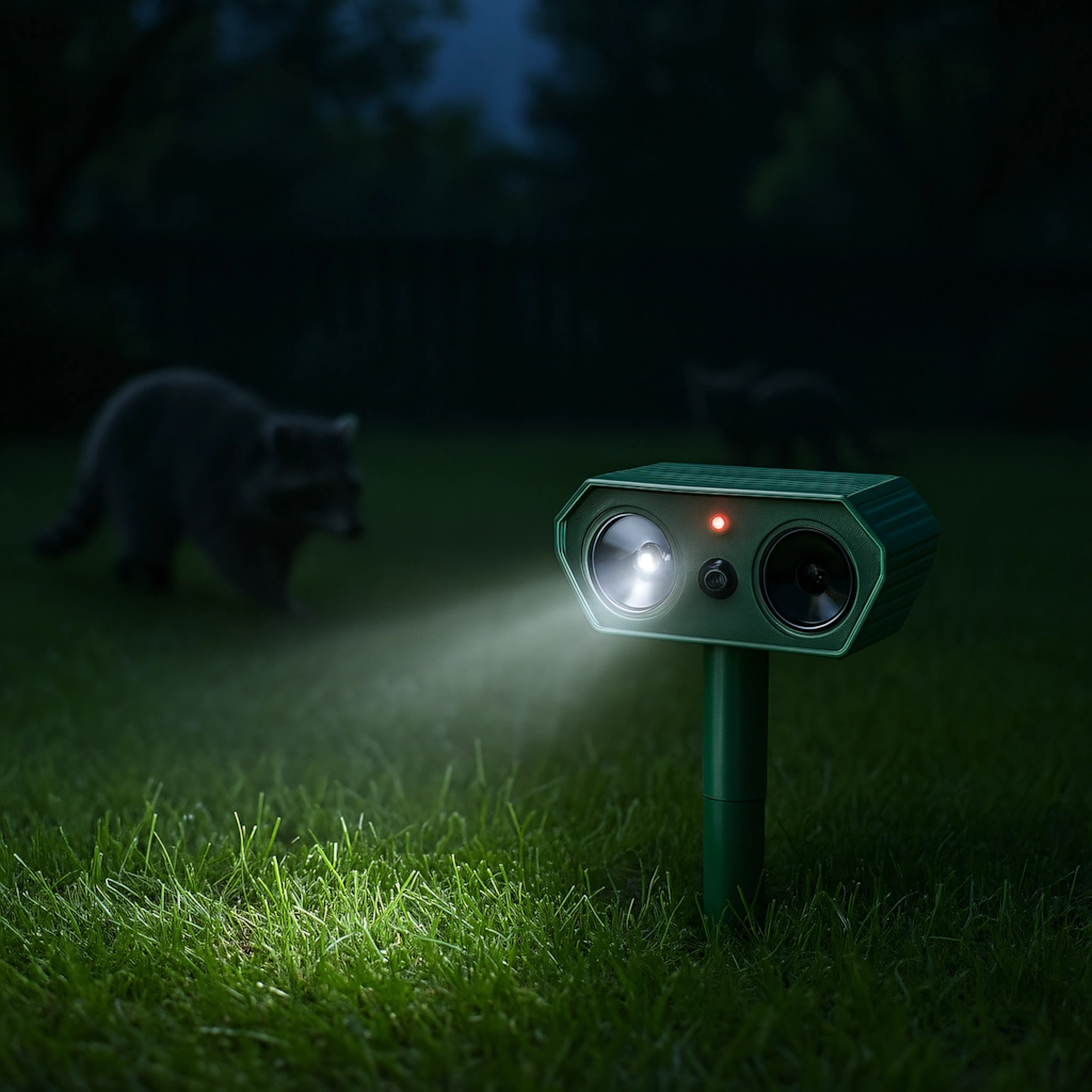 - Automatische activatie – de PIR-sensor schakelt ultrasoon geluid en flitsen alleen in bij beweging.