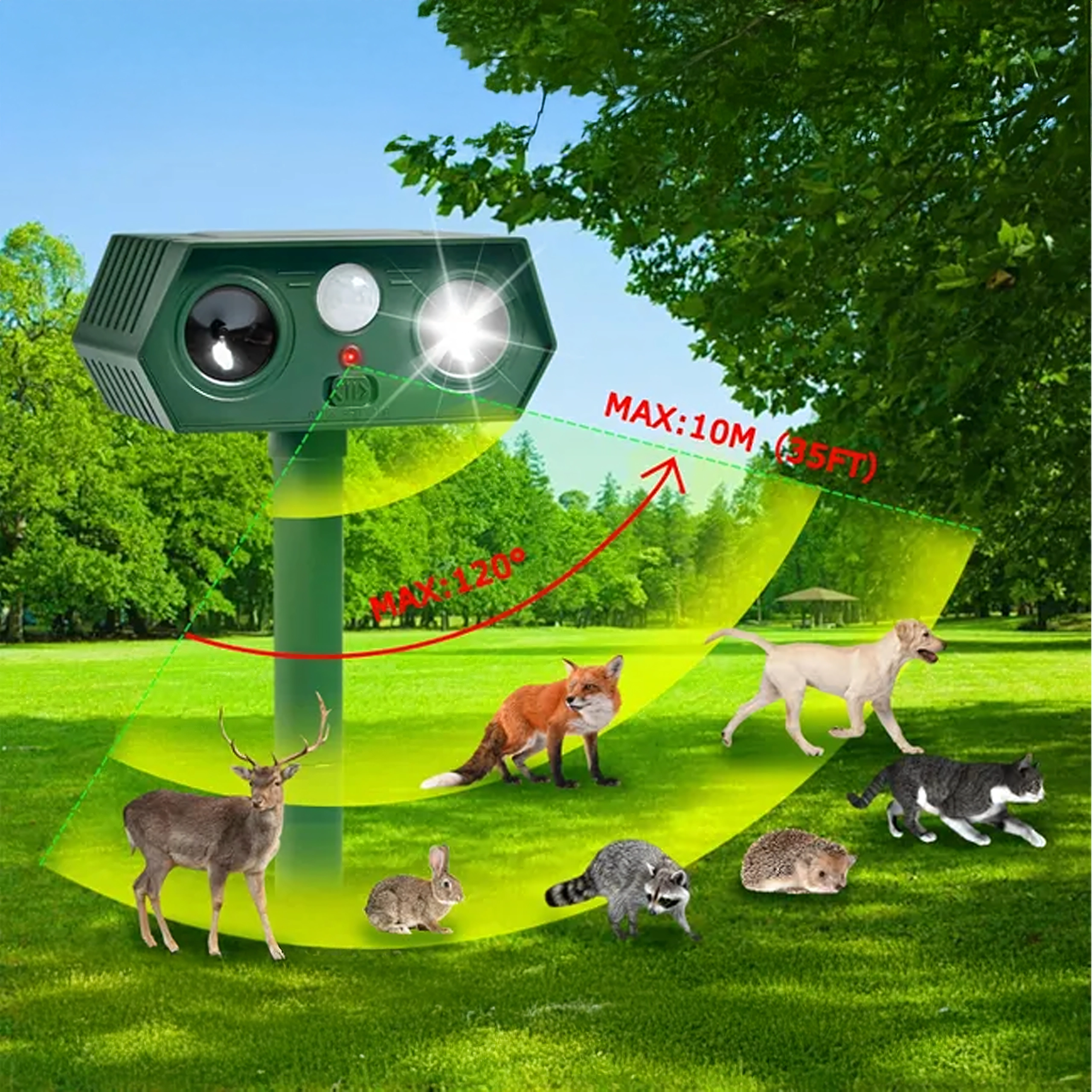 De ultrasone speaker en het felle LED-licht helpen katten, honden, vossen, marters, hazen, eekhoorns, vogels en kleine knaagdieren te weren.