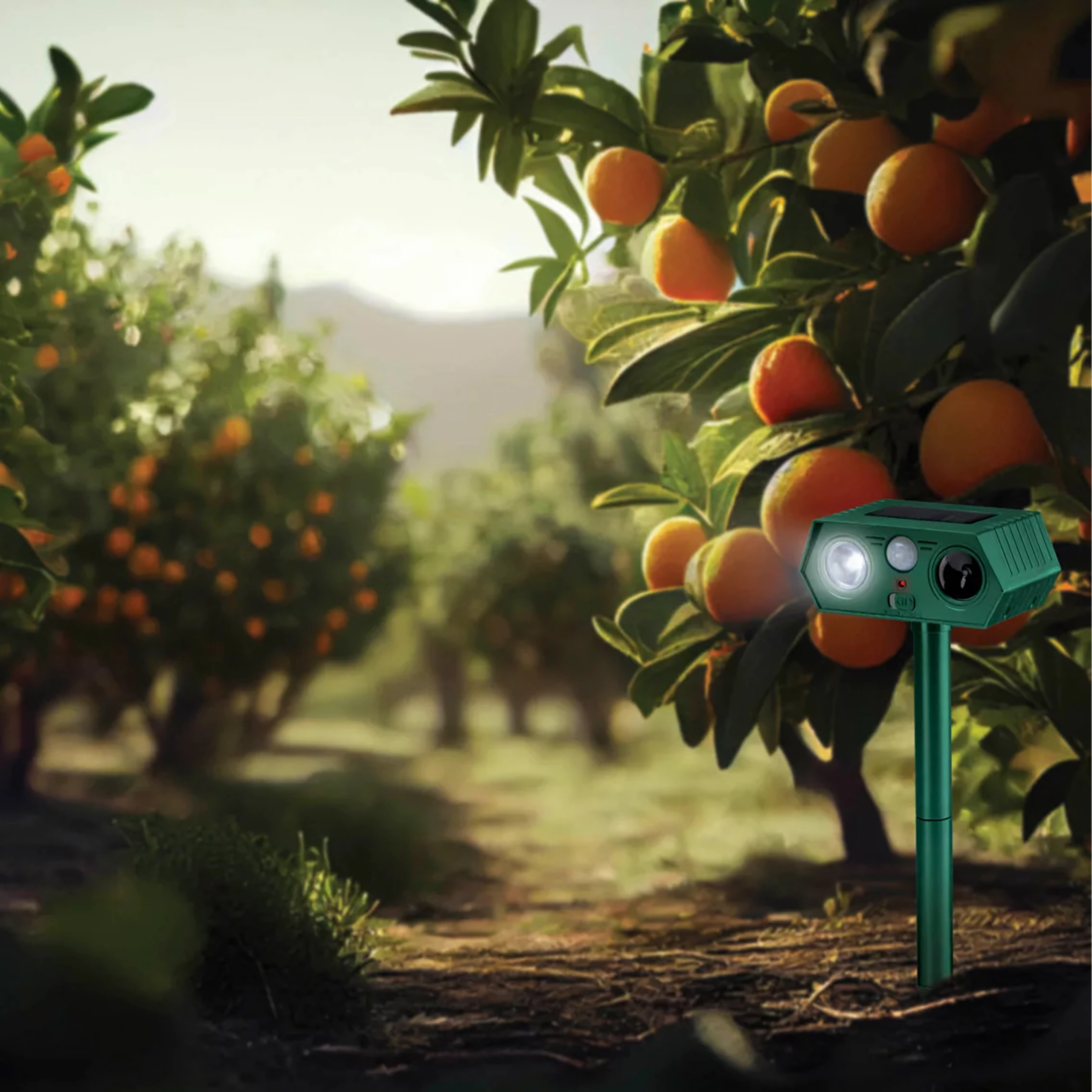 Installatie kost slechts enkele minuten – steek de pin in de grond en stel de richting in. De set van 2 stuks beschermt effectief een groter deel van de tuin, paden of boomgaard. Het apparaat is stil voor mensen, maar onaangenaam voor ongedierte.
