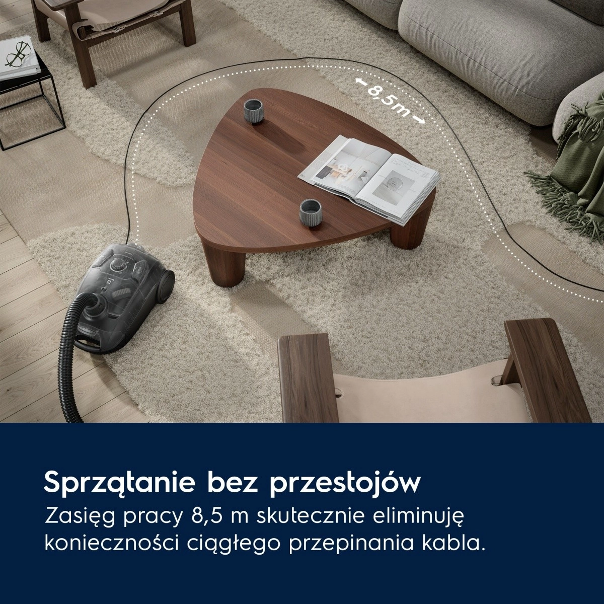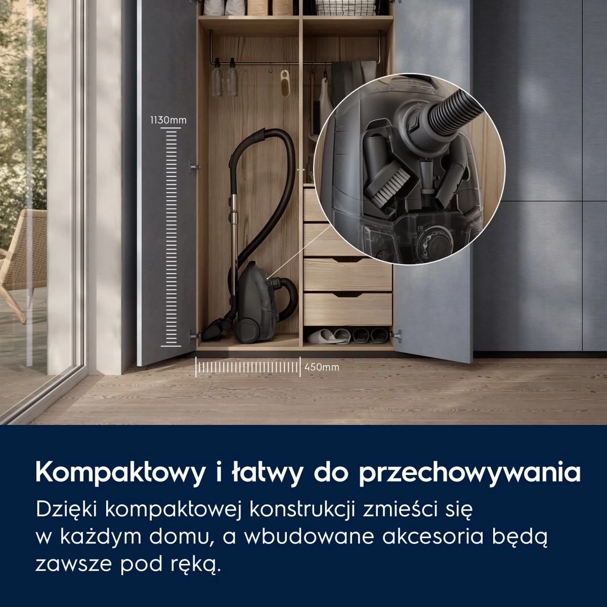 Dankzij de telescoopbuis, grote wielen en een actieradius van 8,5 m bereik je eenvoudig alle hoeken zonder vaak van stopcontact te wisselen. Het filtersysteem vangt tot 99,99% van fijne deeltjes (bijv. stof en huisstofmijt) voor schonere lucht in huis. De compacte behuizing met geïntegreerde accessoire-opslag bespaart ruimte en zorgt dat je alles bij de hand hebt.