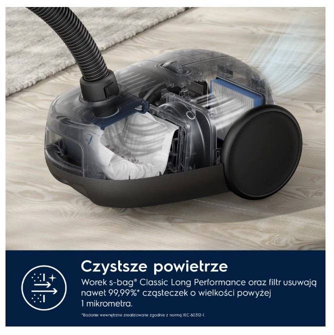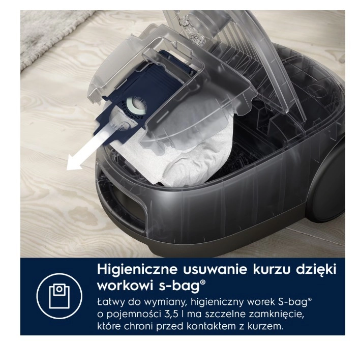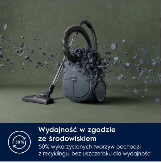 Het model is ontworpen met oog voor duurzaamheid – tot 50% van het plastic is gerecycled en de documentatie wordt op gerecycled papier gedrukt. Voor de beste prestaties raden we originele S-Bag-stofzakken aan, die sterk zijn, beter filteren en meer vuil opnemen dan papieren alternatieven.