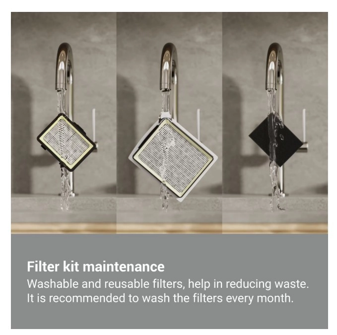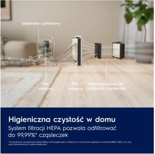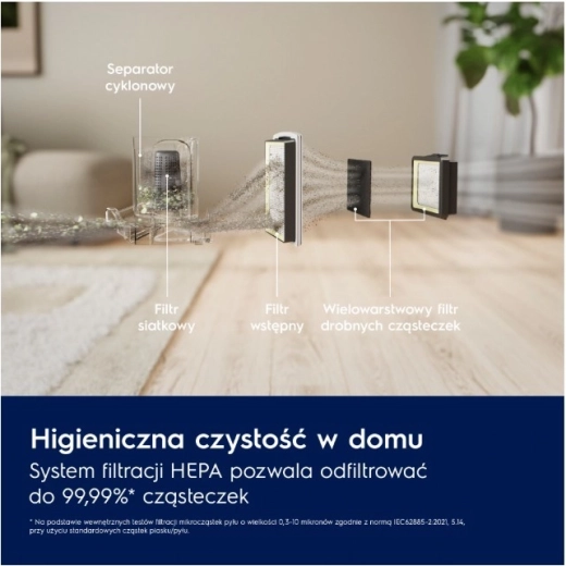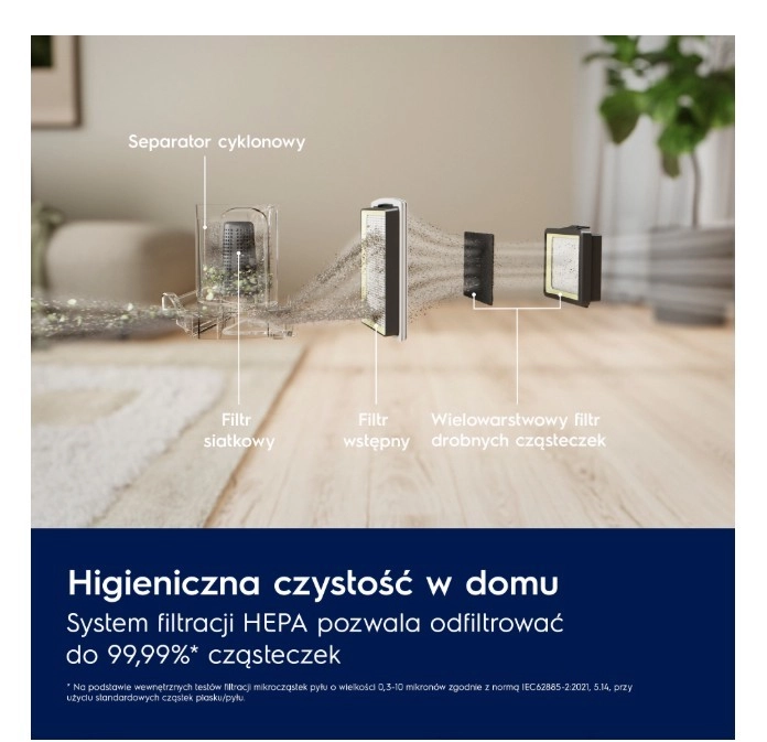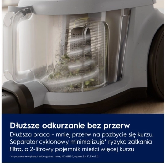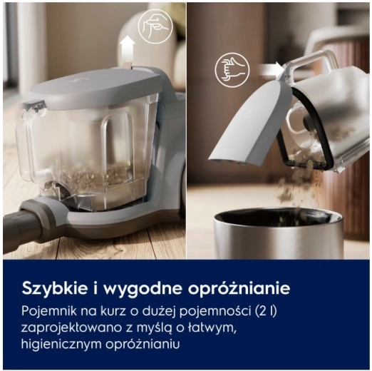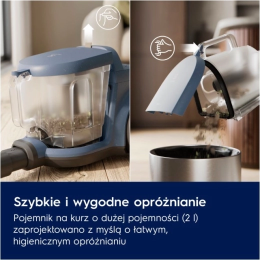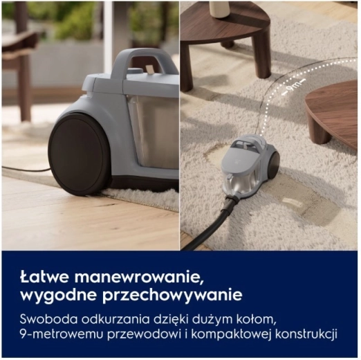 De cycloonseparator‑technologie beperkt verstoppingen en houdt de prestaties stabiel. Het stofreservoir van 2 l is eenvoudig uitneembaar en kan met één hand hygiënisch worden geleegd zonder onnodige rommel. De ergonomische, compacte constructie, grote wielen en een bereik van 9 m maken hanteren en opbergen makkelijk.
