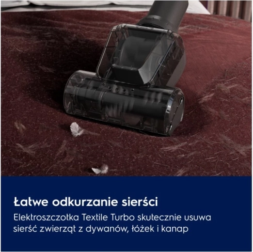 Voor huishoudens met dieren is er de Turbo Textile‑zuigmond, die dierenharen effectief opneemt van tapijten, beddengoed en textiel. De dubbele borstelrol vangt zelfs diepzittende haren en laat oppervlakken perfect schoon achter.
