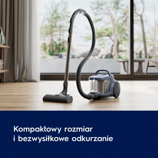 De compacte behuizing, grote wielen en reikwijdte van 9 m maken manoeuvreren en opbergen eenvoudiger. Het HEPA-filtersysteem vangt tot 99,95% van de deeltjes met een grootte van 0,3 µm op, waardoor de lucht in huis schoner wordt.