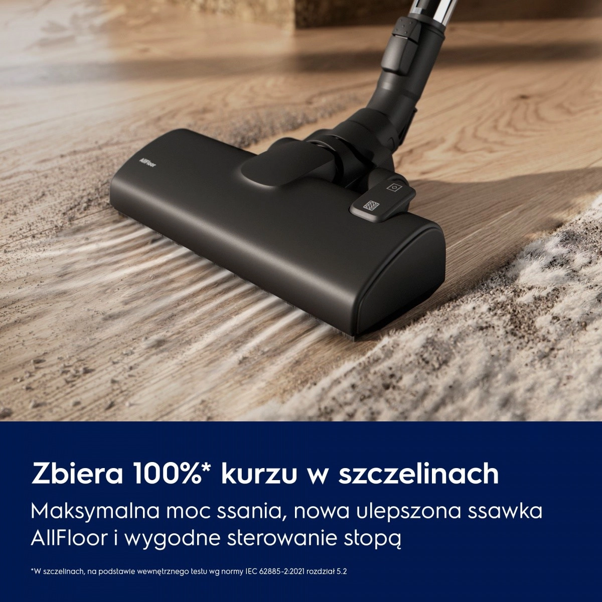 De stofzuiger behaalt een hoge efficiëntie bij het opnemen van stof uit kieren en met de nieuwe AllFloor-mond kan hij zowel harde vloeren als tapijten aan. Het omschakelen van de borstel doe je eenvoudig met je voet.