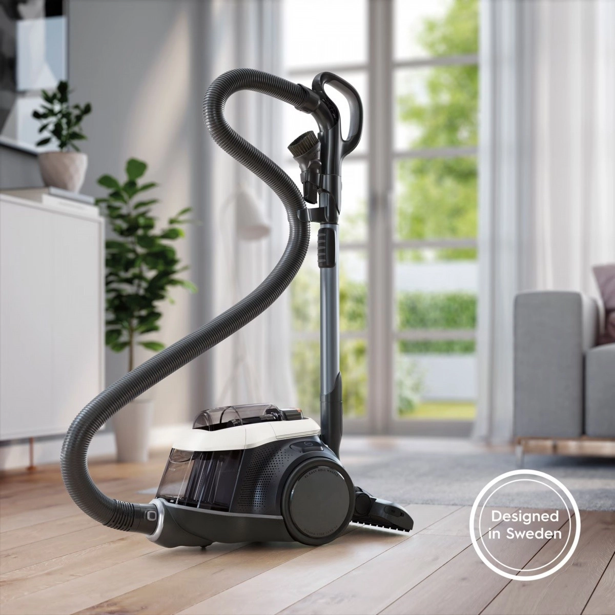De HEPA-filtratie vangt tot 99,999% fijne deeltjes (fijnstof, mijten en allergenen) van 0,3 µm op en draagt zo bij aan schonere lucht in huis. Het intuïtieve ontwerp maakt snel legen van de stofcontainer en gemakkelijke toegang tot de filters mogelijk. Grote, licht draaiende wielen zorgen voor soepele wendbaarheid rond meubels en obstakels.