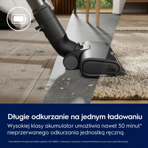 De draadloze constructie met een hoogwaardige 6-cel batterij levert tot 50 minuten werktijd in handunitmodus. Snel losklikken van de handgreep en het wisselen van accessoires zorgen voor een soepele overgang tussen vloeren, hoeken en bekleding. Hygiënisch legen van de 0,5 l stofbak met één knop minimaliseert contact met stof en houdt het huis schoon.