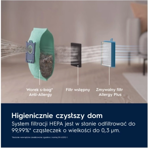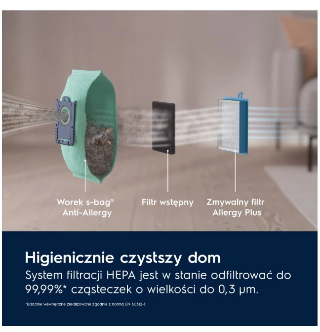 De nieuw ontwikkelde zuigmond OneGo Power Clean neemt zowel fijn als grover vuil effectief op op verschillende oppervlakken. Het hoogwaardige wasbare HEPA‑filter vangt tot 99,99% van de deeltjes van 0,3 μm – stof, mijten en allergenen – voor een hygiënisch schoon huis en frissere lucht.