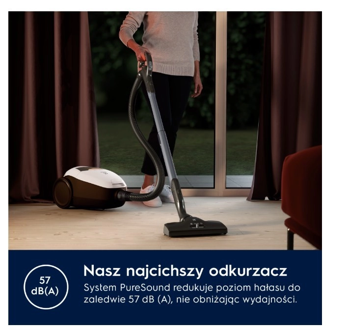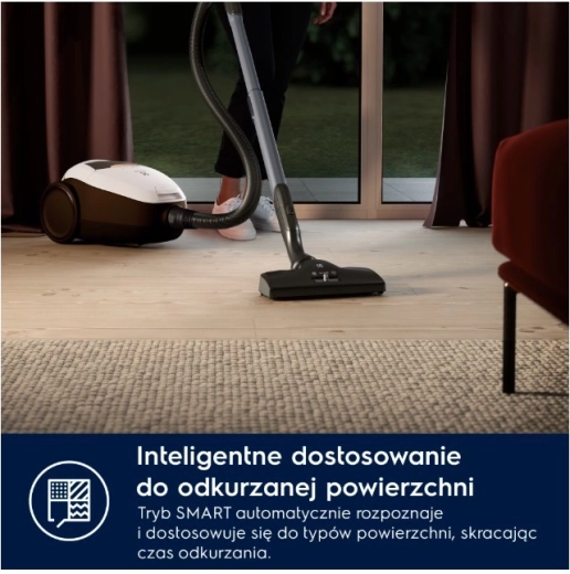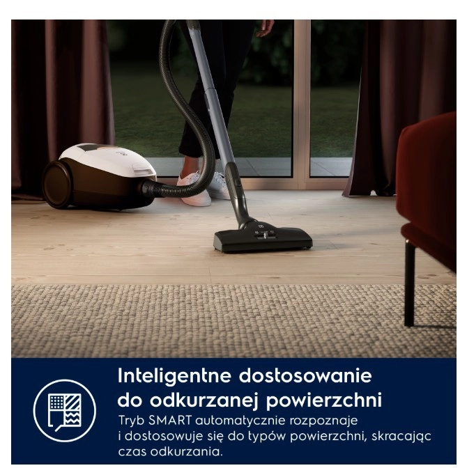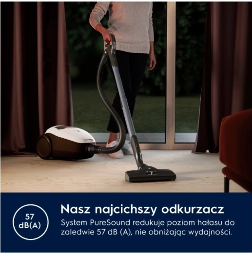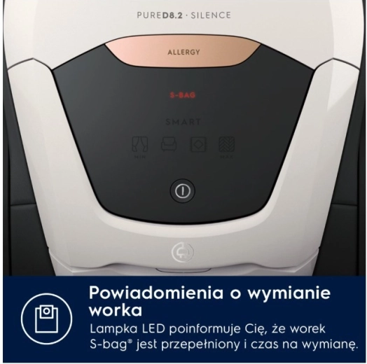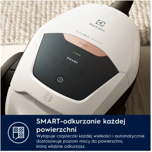 PURE D8.2 SILENCE behoort tot de stilste traditionele stofzuigers met zak – dankzij het innovatieve PureSound-systeem bedraagt het geluidsniveau slechts 57 dB(A). Met de automatische regeling SmartMode herkent hij zelf het oppervlak en past hij het vermogen aan, zodat je naadloos van harde vloer naar tapijt gaat zonder handmatige instelling.