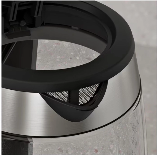 Het deksel met vergrendeling en het uitneembare fijne filter bij de tuit vangen onzuiverheden en kalkaanslag op voor een schonere drank en veiligere bediening.
