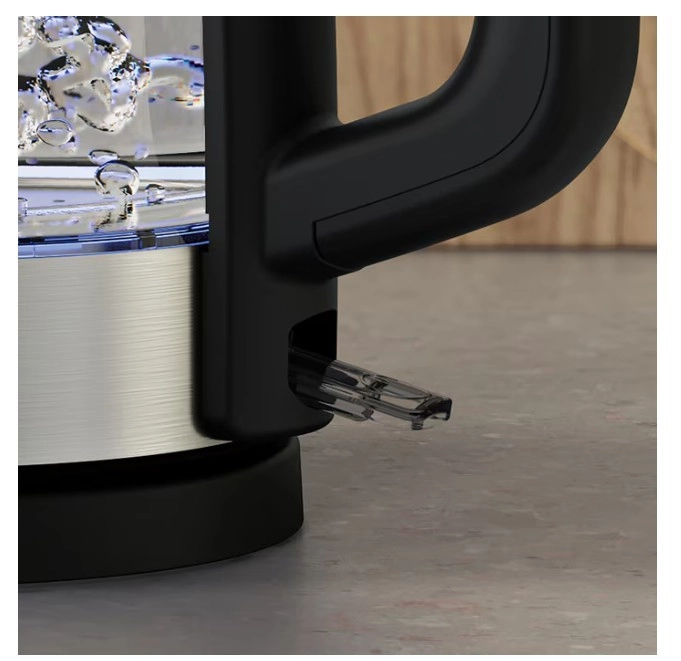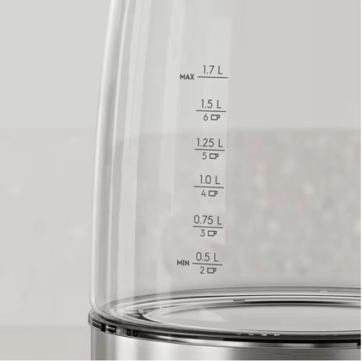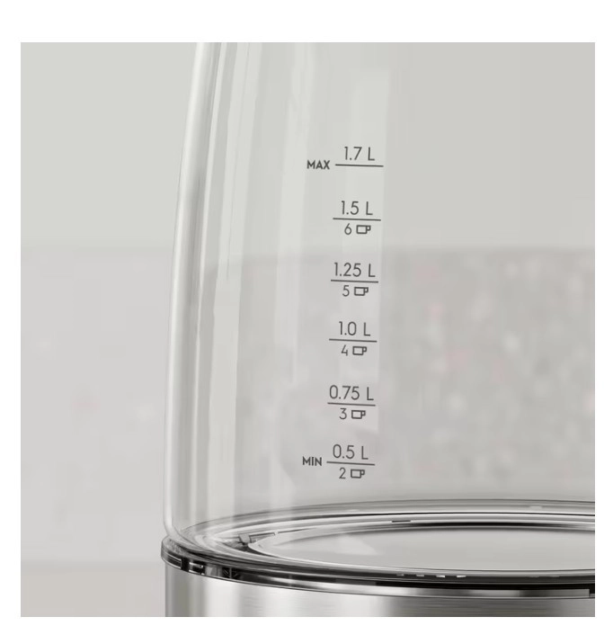 De glazen behuizing met maataanduiding tot 1,7 l laat u in één oogopslag het niveau en het kookpunt zien – u kookt altijd precies de hoeveelheid die u nodig heeft.