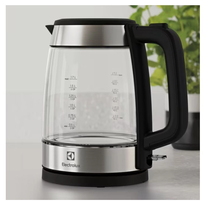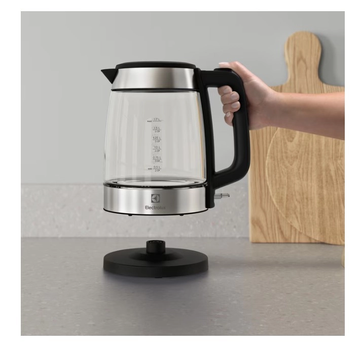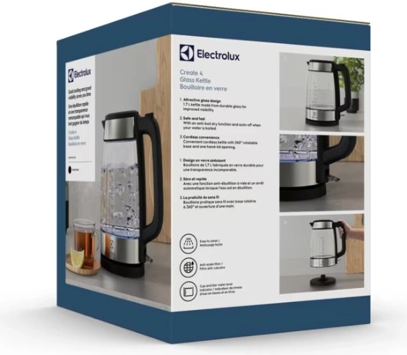 De stijlvolle glazen waterkoker Electrolux Create 4 combineert een elegant design met praktische functies voor dagelijks gebruik. Dankzij het volume van 1,7 l, het 360° draaibare voetstuk en de ergonomische handgreep kookt hij water snel en veilig. Transparant borosilicaatglas maakt het gemakkelijk om het waterniveau te controleren, roestvrijstalen accenten verhogen de duurzaamheid en een fijn filter bij de tuit zorgt voor een schoon ingeschonken drankje.