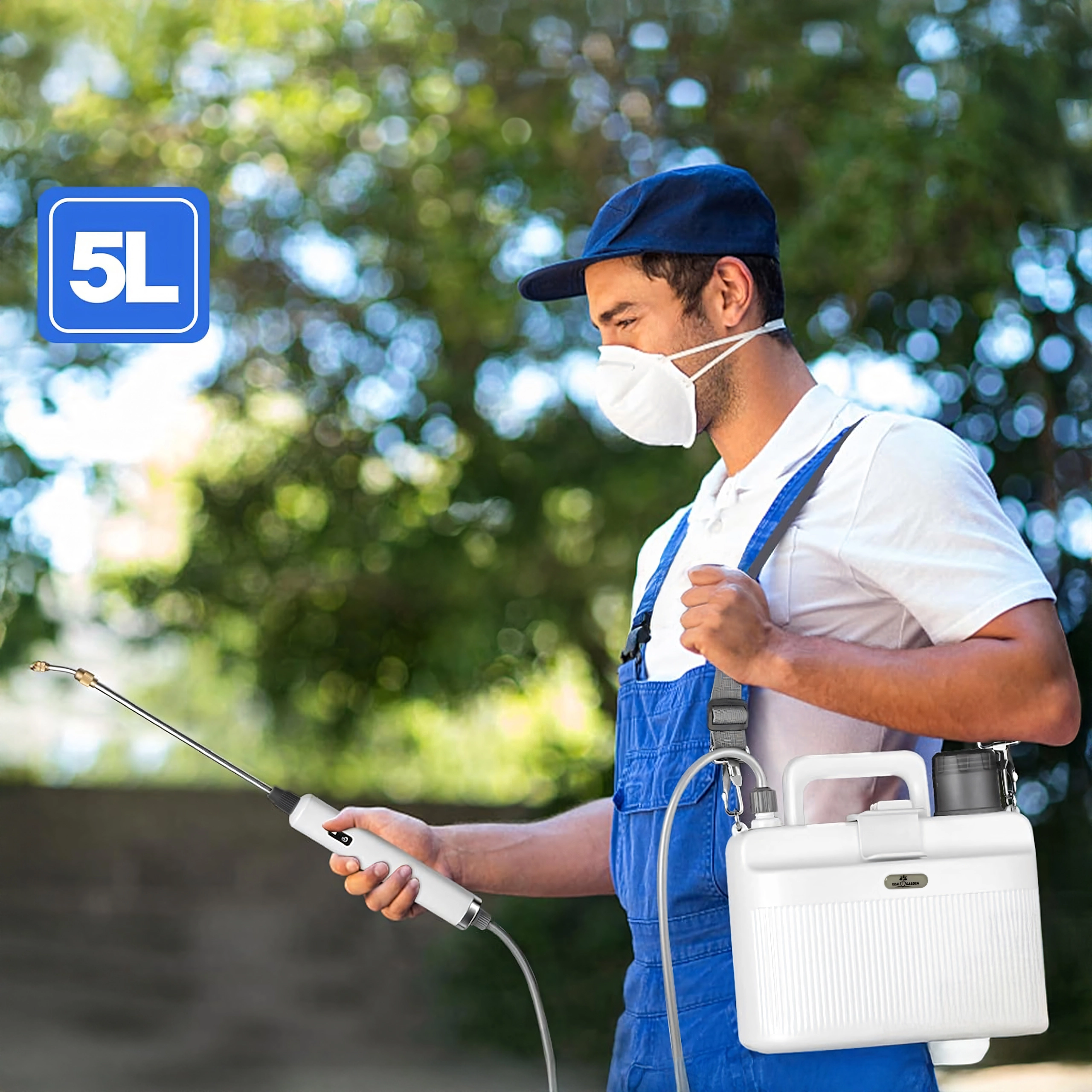 Praktische en lichte elektrische tuinsproeier 5 l met accu 2200 mAh maakt water geven, benevelen en desinfecteren eenvoudiger. Biedt een egale, fijne verneveling, comfortabele bediening met één hand en mobiliteit dankzij de schouderriem – ideaal voor kassen, terrassen en huishoudelijk onderhoud.