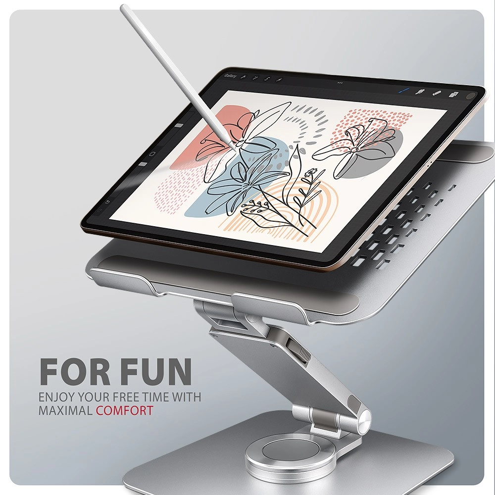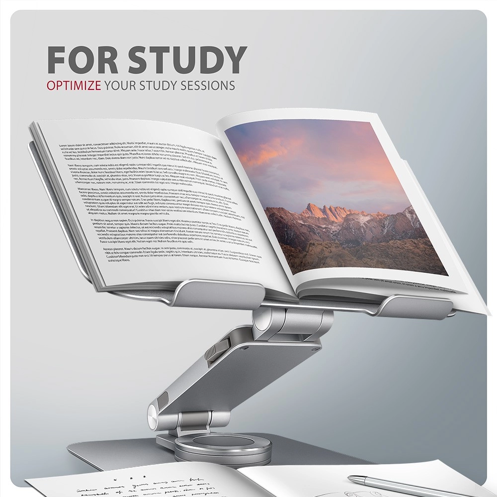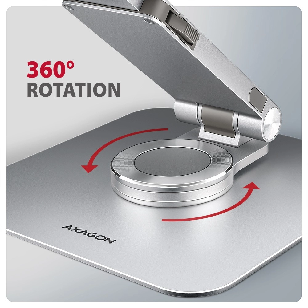 De AXAGON STND-LR is een doordachte standaard voor laptops en tablets die de ergonomie verbetert, zowel thuis als op kantoor. Dankzij de 360° rotatie deel je eenvoudig je scherm of wissel je van orientatie zonder de basis te verschuiven, terwijl het dubbele scharnier en de hoekverstelling helpen om de ideale hoogte en hoek in te stellen om de nekwervelkolom te ontlasten.