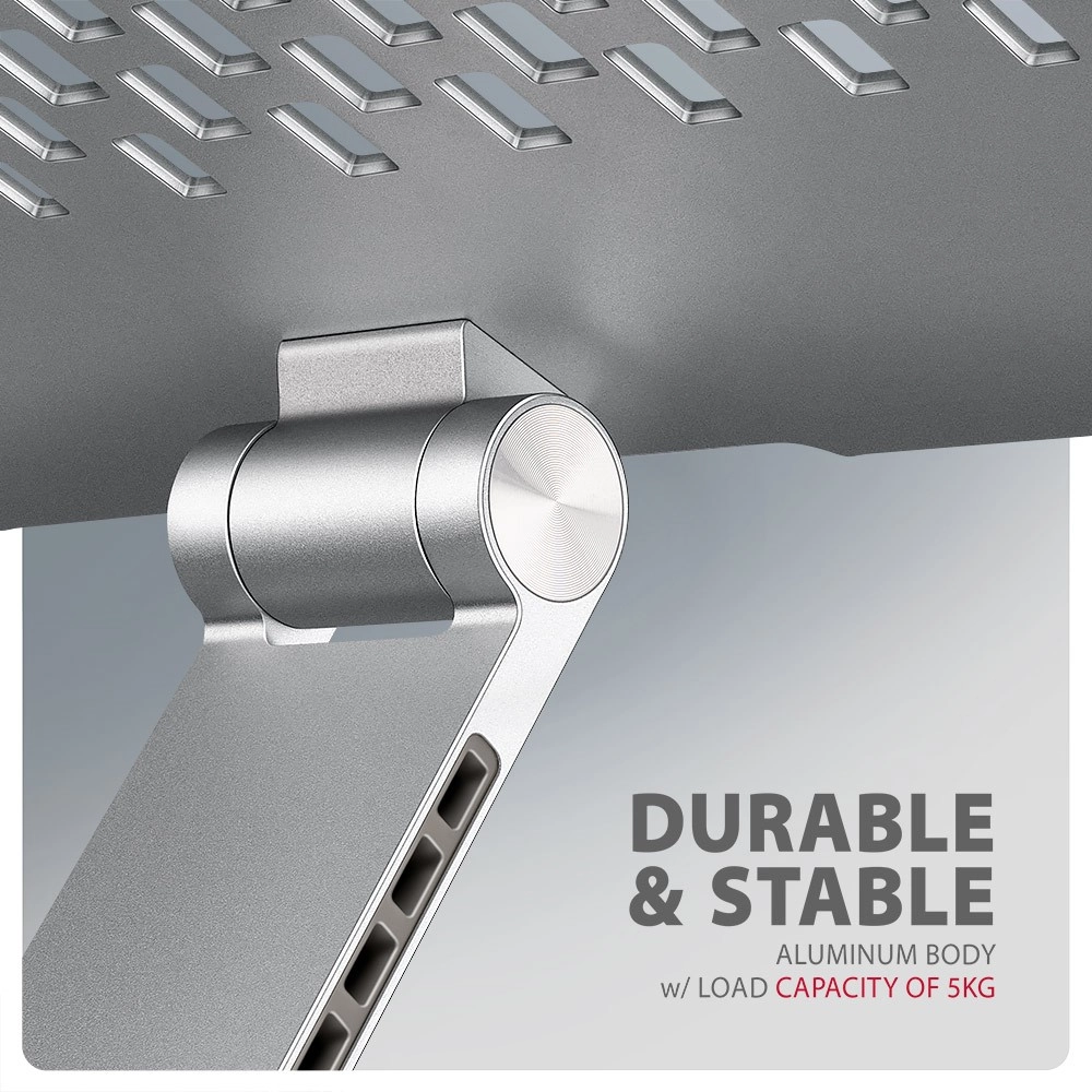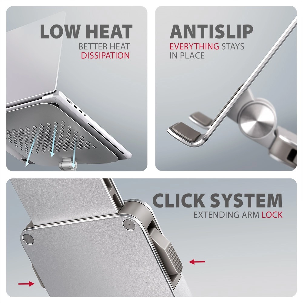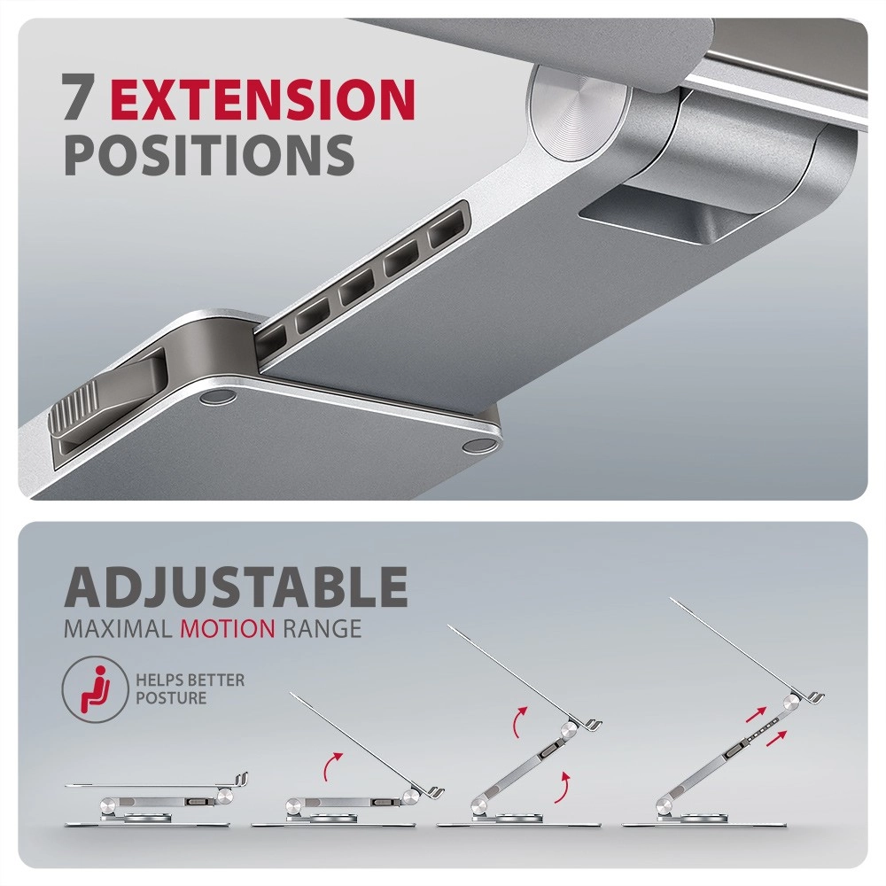 De unieke uitschuifbare arm met vergrendeling (tot 60 mm, 7 standen) brengt het scherm op de optimale kijkafstand en lijnt het uit met een extern beeldscherm. Aluminium gietdelen zorgen voor stevigheid en een lange levensduur, de antislipafwerking houdt het apparaat stevig op zijn plaats en ventilatieopeningen ondersteunen efficiënte koeling voor hogere prestaties en een langere levensduur van de laptop.